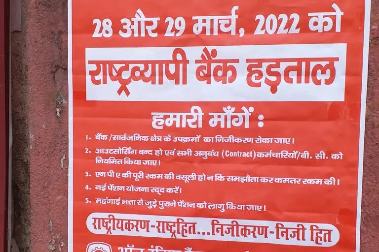 एबीएन सेंट्रल डेस्क। बैंकों और सार्वजनिक क्षेत्र के उपक्रमों के निजीकरण के विरोध और अन्य मांगों के समर्थन में ऑल इंडिया बैंक एम्प्लाइज एसोसिएशन के आह्वान पर 28 और 29 मार्च को सरकारी बैंकों में हड़ताल रहेगा। ऑल इंडिया बैंक एंप्लाइज एसोसिएशन के नेतृत्व में झारखंड प्रदेश बैंक इंप्लाइज एसोसिएशन ने भी बंद को सफल बनाने के लिए तैयारियां शुरू कर दी है। सभी बैंकों के मेन गेट पर प्रस्तावित हड़ताल के बैनर पोस्टर चिपका दिए गए हैं और मुख्य मांगों की जानकारी दी गयी है। ऑल इंडिया बैंक एम्प्लाइज एसोसिएशन के आह्वान पर बैंकों में 28 और 29 मार्च को हड़ताल की वजह से लगातार चार दिन बैंक बंद रहेंगे। क्योंकि 26 मार्च को महीने का चौथा शनिवार है और 27 मार्च को रविवार है और उस दिन बैंक बंद रहता है। अगले दो दिन सोमवार और मंगलवार को हड़ताल की वजह से कामकाज प्रभावित रहेंगे।