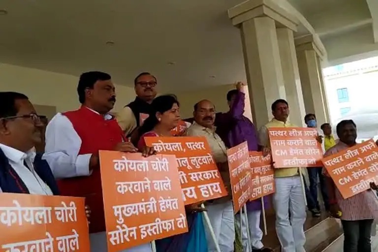 टीम एबीएन, रांची। झारखंड विधानसभा बजट सत्र के 13वें दिन भाजपा विधायक मुख्यमंत्री पर कोयला, बालू और पत्थर खनन की लीज अपने नाम करने का आरोप लगाते हुए सदन के बाहर हाथों में तख्ती लेकर प्रोटेस्ट करते नजर आए। इसके साथ ही विपक्ष ने मुख्यमंत्री हेमंत सोरेन से इस्तीफे की मांग की है। भाजपा विधायकों का कहना है कि यह मुद्दा सदन के अंदर भी गरमाया रहेगा और मुख्यमंत्री हेमंत सोरेन को नैतिकता के आधार पर अपने पद से इस्तीफा दे देना चाहिए। विपक्ष के विरोध पर सरकार के मंत्री मिथलेश ठाकुर ने कहा कि मुख्यमंंत्री को भी अपनी दाल रोटी की चिंता करने का अधिकार है। भाजपा को लगता है कि वो सही है तो उचित प्लेटफार्म पर बातों को रखना चाहिए। सदन में हंगामा करने का कोई मतलब नहीं है।