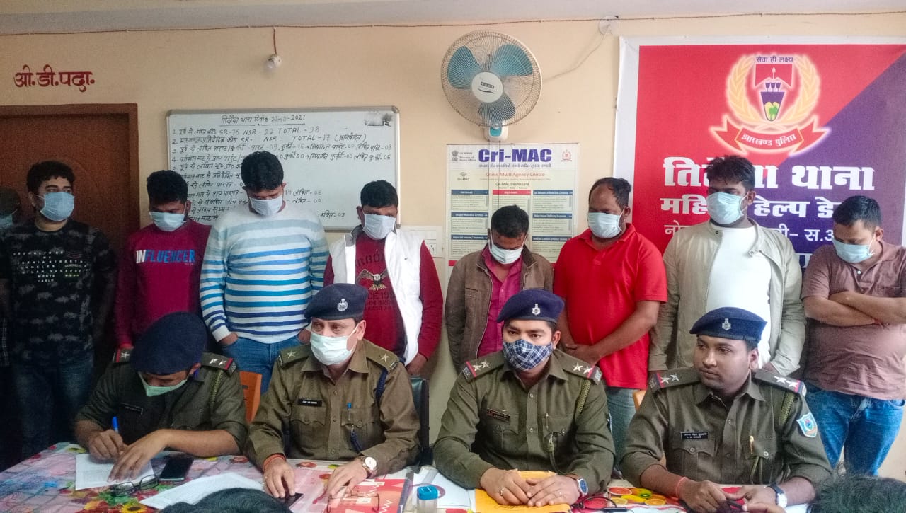 कोडरमा। तिलैया थाना क्षेत्र के इंदरवा छठ तालाब के समीप एक पक्के मकान में जुआ संचालन की सूचना पर सोमवार की रात तिलैया पुलिस ने एक बड़ी कार्रवाई की है। मंगलवार की सुबह तिलैया थाना में प्रेस वार्ता आयोजित कर तिलैया थाना प्रभारी अजय कुमार सिंह ने बताया कि सोमवार की रात गुप्त सूचना मिलने पर पुलिस टीम के द्वारा तिलैया थाना क्षेत्र के इंदरवा छठ तलाब रोड स्थित सौरभ कुमार के घर पर रात करीब 12:30 बजे घेराबंदी कर छापेमारी की गई। जहां एक कमरे के भीतर से 11 लोगों को जुआ खेलते हुए गिरफ्तार किया गया है। तिलैया थाना प्रभारी अजय सिंह ने बताया कि सौरभ कुमार के घर को अवैध तरीके से राहुल सिंह के द्वारा जुआ अड्डा के संचालन के रूप में इस्तेमाल किया जा रहा था। पुलिस की कार्रवाई के दौरान राहुल सिंह, संजीव कुमार, शशांक सिंह, प्रभु वर्मा, संतोष कुमार, सौरभ कुमार, गुरमीत सिंह, अमरनाथ कुमार, लक्ष्मीकांत मेहता, सूरज कुमार एवं पप्पू मेहता को गिरफ्तार किया गया है। तिलैया थाना प्रभारी अजय सिंह ने बताया कि छापेमारी के दौरान घटनास्थल से 4 लाख 10 हज़ार एक सौ रुपये बरामद किया गया। इस दौरान जुआ अड्डा पर कई गाड़ियों को भी पुलिस के द्वारा जप्त किया गया है। जब्त गाड़ियों में एक बलेनो कार, स्विफ्ट डिजायर कार, पल्सर मोटरसाइकिल, टीवीएस कंपनी की स्कूटी शामिल है। तिलैया थाना प्रभारी ने बताया कि इस मामले में प्राथमिकी दर्ज करने के बाद सभी एक 11 लोगों को गिरफ्तार कर जेल भेज दिया जाएगा। छापेमारी दल में पुलिस अवर निरीक्षक ऋषिकेश कुमार सिन्हा, आनंद मोहन कुमार, सहायक अवर निरीक्षक विकेश कुमार, हवलदार अगनु साहू, अशोक पंडित, पैंथर जवान उमेश कुमार, उदय कुमार, अनिल कुमार यादव शामिल थे।