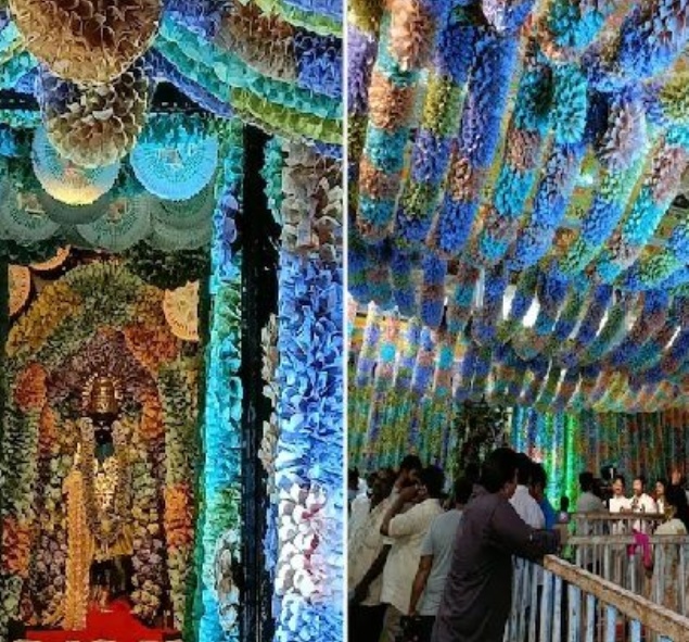 आंध्र प्रदेश। आंध्र प्रदेश के नेल्लोर स्थित कन्याका परमेश्वरी मंदिर को दशहरा के मौके पर 5 करोड़ 16 लाख रुपये मूल्य के नोटों से सजाया गया है। इस मंदिर में साल के अलग-अलग समय पर देवी के विभिन्न रूपों की पूजा की जाती है। नौ दिवसीय नवरात्र-दशहरा समारोह के दौरान उन्हें धन की देवी धनलक्ष्मी के रूप में पहना जाता है और उनकी पूजा की जाती है। 100 से अधिक स्वयंसेवकों ने मंदिर को सजाने के लिए लंबे समय तक काम किया। सजावट के लिए 2,000 रुपये, 500 रुपये, 200 रुपये, 100 रुपये, 50 रुपये और 10 रुपये के नोटों का इस्तेमाल किया गया है। चार साल पहले 11 करोड़ रुपये की लागत से पुराने कन्याका परमेश्वरी मंदिर का जीर्णोद्धार किया गया था। तब से नवरात्रि दशहरा समारोह हर साल भव्य रूप से आयोजित किया जाता है। नेल्लोर शहरी विकास प्राधिकरण के अध्यक्ष मुक्कला द्वारकानाथ घटनाओं ने कहा कि 7 किलोग्राम सोना और 60 किलोग्राम चांदी देवी को सुशोभित करने के लिए उपयोग की जाती है।