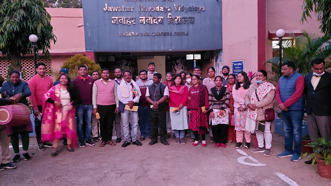 टीम एबीएन, गुमला। घाघरा प्रखंड स्थित जवाहर नवोदय विद्यालय गुमला में आज दिनांक 31.01.22 (सोमवार) को कला विभाग के प्रबुद्ध शिक्षक डीएन महतो के 27 साल नवोदय विद्यालय समिति को अपना अपूर्व योगदान देते हुए उनके अवकाश प्राप्ति के सुनहरे अवसर पर एक विदाई समारोह आयोजित किया गया। आयोजन में प्राचार्य, कला शिक्षक सपरिवार तथा विद्यालय के सभी कर्मचारी उपस्थित रहे। सेवा की शुरुआत करते हुए सर्वप्रथम जवाहर नवोदय विद्यालय दरभंगा ( 01.07.1995- 08.09.2002) में इन्होंने अपना अभूतपूर्व योगदान दिया। तत्पश्चात गोपालगंज, गिरिडीह में भी ये कार्यरत रहे। उसके बाद 21.08.21- 31.01.22 तक जवाहर नवोदय विद्यालय गुमला में अपना बहुमूल्य योगदान दिया। कार्यक्रम में आकाश सैनी (पीजीटी केमिस्ट्री), वशिष्ठ पाण्डे (टीजीटी उड़िया), ज्योति टूटी मैम (टीजीटी सोशल साइंस), रामाशीष गोस्वामी (पीजीटी अंग्रेजी) एवं अन्य सभी शिक्षकों ने उनके व्यक्तित्व के बारे में बताया कि किस प्रकार उन्होंने बच्चों को कला शिक्षण के साथ-साथ जीवन जीने की कला भी सिखाई। साथ ही उनके साथ बिताए गए सुखद अनुभवों को याद करते हुए सबके साथ साझा किया। प्राचार्य ने भी उनके कर्म एवं व्यवहार पर प्रकाश डालते हुए बताया कि किस प्रकार उन्होंने विद्यालय के सभी महत्वपूर्ण कार्यों में अपनी अमूल्य भूमिका निभाते हुए सभी बच्चों के गुणवत्ता पूर्ण शिक्षा के साथ -साथ बच्चो के सर्वांगीण विकास के लिए सदा अग्रसर रहे। कार्यक्रम की अंतिम कड़ी में सबके प्रिय कला शिक्षक डीएन महतो ने सबसे पहले प्राचार्य का आभार व्यक्त किया तथा सभी शिक्षकों एवं कर्मचारियों को धन्यवाद देते हुए कहा कि सभी के सहयोग एवं सौहार्दपूर्ण व्यवहार के कारण ही नवोदय विद्यालय में सकारात्मक तरीके से अपनी सेवा देने में सफल रहे। अंत में प्राचार्य महोदय ने उनके भावी जीवन की मंगल कामना करते हुए उन्हें स्मृति चिह्न भेंट किया। इस प्रकार सभी कर्मचारियों ने उनके उज्जवल भविष्य की कामना करते हुए नम आंखों से उन्हें विदाई दी।