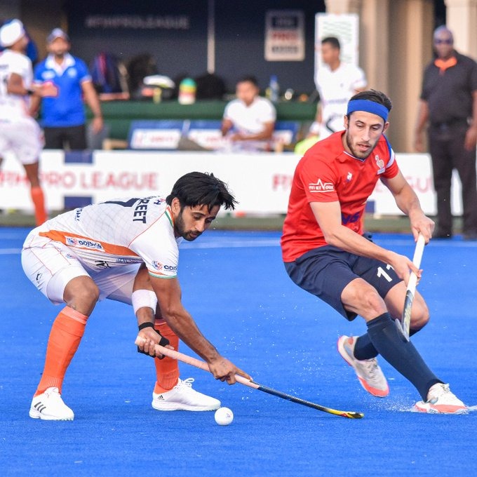 एबीएन स्पोर्ट्स डेस्क। फ्रांस की पुरुष हॉकी टीम ने शनिवार को भारत को 5-2 शिकस्त देकर प्रो लीग में पहली जीत दर्ज की। फ्रांस की ओर से विक्टर चार्लेट ने 16वें और 59वें मिनट, विक्टर लॉकवुड ने 35वें और मेसन चार्ल्स ने 48वें और क्लेमेंट टिमोथी ने मैच के 60वें मिनट में गोल किए जबकि भारत की ओर से जरमनप्रीत सिंह ने मैच के 22वें और हरमनप्रीत सिंह ने मुकाबले के 57वें मिनट में गोल किए। मैच के पहले क्वार्टर की शुरुआत काफी धीमी रही। दोनों टीमों ने सधी हुई शुरुआत की, खेल के पहले 15 मिनट में दोनों टीमों को गोल के लिए संघर्ष करना पड़ा लेकिन दोनों ही टीम खाता खोलने में असफल रहीं। फ्रांस की टीम ने दूसरे क्वार्टर की शानदार शुरुआत की। खेल के 16वें मिनट में ही विक्टर ने पेनाल्टी कॉर्नर का फायदा उठाते हुए भारतीय गोलकीपर पाठक बहादुर को चकमा दिया और गोल कर टीम का खाता खोल दिया। खेल के 22वें मिनट में भारतीय टीम ने पलटवार किया। जरमनप्रीत सिंह ने डिफेंस को छकाते हुए गोल किया और खाता खोला। हाफ-टाइम के बाद स्कोर 1-1 से बराबर रहा। तीसरे क्वार्टर में फ्रांस की टीम ने फिर आक्रामक खेल शुरू किया। खेल के 35वें मिनट में फ्रांस की टीम दबाव का फायदा उठाया और विक्टर लॉकवुड ने फील्ड गोल कर अपनी टीम को मैच में 2-1 से बढ़त दिला दी। खेल के चौथे क्वार्टर में फ्रांस की टीम ने तीन और गोल किए और भारतीय टीम की वापसी के सारे दरवाजे बंद कर दिए। अब भारत का अगला मुकाबला रविवार को मेजबान दक्षिण अफ्रीका से होगा।