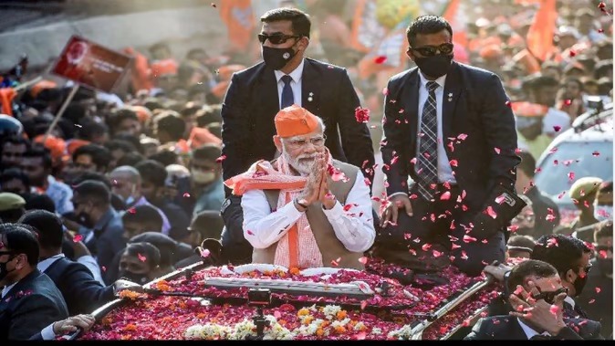 एबीएन सेंट्रल डेस्क। पांच में से चार राज्यों में प्रचंड जीत के एक दिन बाद ही पीएम नरेंद्र मोदी गुजरात विधानसभा चुनाव की तैयारियों में लग गए हैं। यूपी, गोवा, मणिपुर और उत्तराखंड के चुनाव परिणाम जारी होने के अगले ही दिन पीएम मोदी गुजरात पहुंच गए हैं। वे दो दिवसीय गुजरात दौरे पर हैं। यहां साल के अंत में विधानसभा चुनाव होने हैं। ऐसे में पीएम मोदी आज मेगा रोड शो के जरिए भाजपा की चुनावी तैयारियों का शंखनाद करेंगे। एक घंटे में नौ किलोमीटर लंबा रोड शो : पीएम मोदी अहमदाबाद पहुंच चुके हैं। यहां एयरपोर्ट से वह गांधीनगर भाजपा कार्यालय कमलम जाएंगे। इस दौरान पीएम मोदी एक घंटे में करीब नौ किलोमीटर का फासला तय करेंगे। दावा है कि इस रोड शो में चार लाख से ज्यादा लोग शामिल होंगे। कोरोना काल के बाद यह सबसे बड़ा सार्वजनिक आयोजन होगा। जानकारी के मुताबिक, पीएम मोदी के स्वागत के लिए सड़क के दोनों ओर 50 से ज्यादा मंच बनाए गए हैं। भाजपा कार्यालय पहुंचने के बाद पीएम स्थानीय नेताओं के साथ बैठक करेंगे। वहीं शाम को वह पंचायत प्रतिनिधियों को भी संबोधित करेंगे।