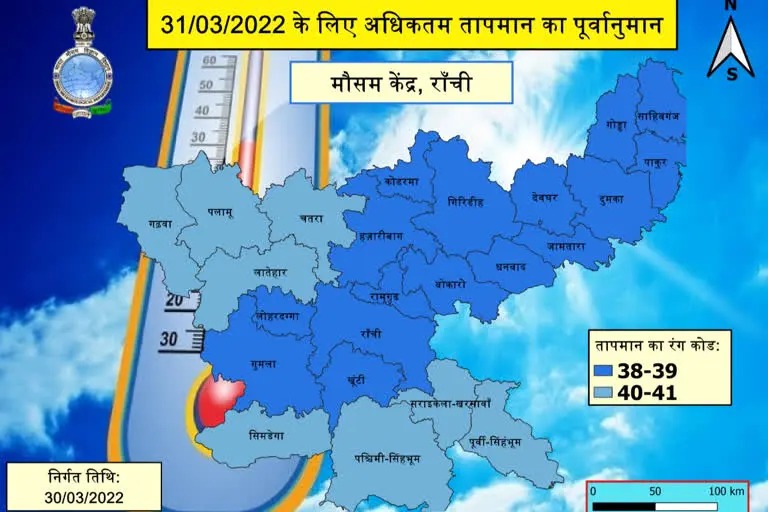 टीम एबीएन, रांची। झारखंड में गर्मी बढ़ने के साथ लोगों की मुसीबत बढ़ गई है। राजधानी रांची समेत कई जिलों में लू चलने लगी है। मौसम विज्ञान केंद्र रांची ने 30 मार्च से हीट वेव चलने को लेकर येलो अलर्ट जारी किया है। मौसम विज्ञान केंद्र रांची ने लोगों को हीट वेव चलने के दौरान सावधानी बरतने की अपील की है। डाल्टनगंज में तापमान 41 डिग्री के पार चला गया है। मौसम विज्ञान केंद्र रांची के अनुसार राज्य में अगले दो-तीन दिनों में 2 से 3 डिग्री तापमान में बढ़ोतरी होने का अनुमान है। मौसम विज्ञान केंद्र रांची से मिली जानकारी के अनुसार उत्तर पश्चिम में गर्म हवा चलने की वजह से झारखंड के तापमान में लगातार बढ़ोतरी हो रही है। 30 मार्च को गढ़वा, पलामू, चतरा, सिमडेगा, पूर्वी सिंहभूम और पश्चिमी सिंहभूम जिले में कई जगहों पर लू चली। 31 मार्च को लेकर मौसम विज्ञान केंद्र रांची ने चेतावनी जारी करते हुए कहा है कि गढ़वा, पलामू, लातेहार, चतरा, बोकारो, धनबाद, सिमडेगा, पूर्वी सिंहभूम और पश्चिम सिंहभूम जिले में कई जगहों पर लू चल सकती है। मौसम विज्ञान केंद्र रांची के अनुसार झारखंड में अगले 2 दिनों के दौरान अधिकतम तापमान में 2 से 3 डिग्री तापमान में वृद्धि की संभावना है। उसके बाद अगले 3 दिन में कोई बड़ा बदलाव होने की संभावना नहीं है। पिछले 24 घंटों में राज्य में मौसम शुष्क रहा। इस दौरान उच्चतम तापमान 41.2 डिग्री सेल्सियस डाल्टनगंज में रिकॉर्ड किया गया। जबकि न्यूनतम तापमान गढ़वा में 17.5 डिग्री सेल्सियस रिकॉर्ड किया गया। झारखंड में अन्य जिलों में तापमान की बात करें तो रांची में अधिकतम तापमान 37.2, जमशेदपुर में 40.5, डाल्टनगंज में 41.2, बोकारो 38.1, चाईबासा में 39.4, देवघर में 38.4 डिग्री सेल्सियस दर्ज हुआ है। वहीं, न्यूनतम तापमान की बात करें तो रांची में 19.7, जमशेदपुर में 20.0, डाल्टनगंज 21.3, बोकारो में 20.1, चाईबासा में 21.6 और देवघर में 22.5 रिकॉर्ड किया गया है।