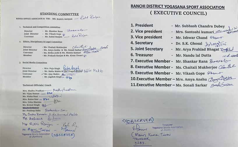 टीम एबीएन, रांची। आज दिनांक 18/01/2025 दिन शनिवार को महावीर टावर के समाधान कार्यालय में योगसना स्पोर्ट्स एसोसिएशन आफ झारखंड के द्वारा चयनित पर्यवेक्षक एवं योगासन झारखंड राज्य कोषाध्यक्ष मनोज तिवारी के तत्वावधान में रांची जिला इकाई के कार्यकारी समिति एवं स्थायी समिति का गठन किया गया।