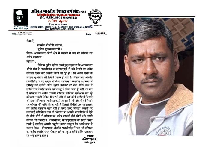 एबीएन न्यूज नेटवर्क, धनबाद। अखिल भारतीय पिछड़ा वर्ग संघ के जिलाध्यक्ष रत्नेश कुमार ने झारखंड डीजीपी को पत्र लिखकर कहा कि अंगारपथरा ओपी क्षेत्र के गजलीटांड़ व कांटापहाड़ी में बड़े पैमाने पर अवैध कोयला खनन कर तस्करी किया जा रहा है। अवैध खनन के कारण भू-धंसान की स्थिति उत्पन्न हो रही है।