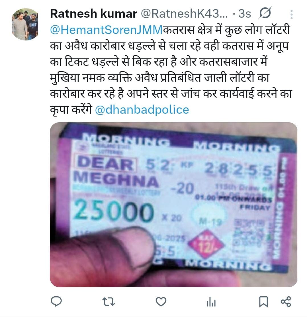 जिससे बाघमारा में जहां जहां अवैध लॉटरी कारोबार से लॉटरी सिंडिकेट तथा कुछ लोग मलमल हो रहे है वहीं सैकड़ों मजदूर वर्ग के लोग ओर माध्यम वर्ग के लोग कंगाल बन रहे है जिससे कतरास क्षेत्र में कुछ अवैध लॉटरी कारोबारी धनबाद एसएसपी महोदय के साथ साथ स्थानीय थाना को भी बदनाम कर रहे है इसलिए आप अपने स्तर से जांच कराकर आवश्यक कार्रवाई करने का कृपा करेंगे ताकि भ्रष्टाचार पर अंकुश लग सके ।
