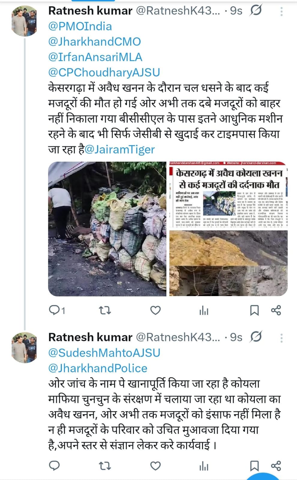 कोयला माफिया चुनचुन के संरक्षण में चलाया जा रहा था कोयला का अवैध खनन। अभी तक मजदूरों को इंसाफ नहीं मिला है न ही मजदूरों के परिवार को उचित मुआवजा दिया गया है, जिसको लेकर अखिल भारतीय पिछड़ा वर्ग संघ के जिला अध्यक्ष रत्नेश कुमार ने ट्वीट किया है।