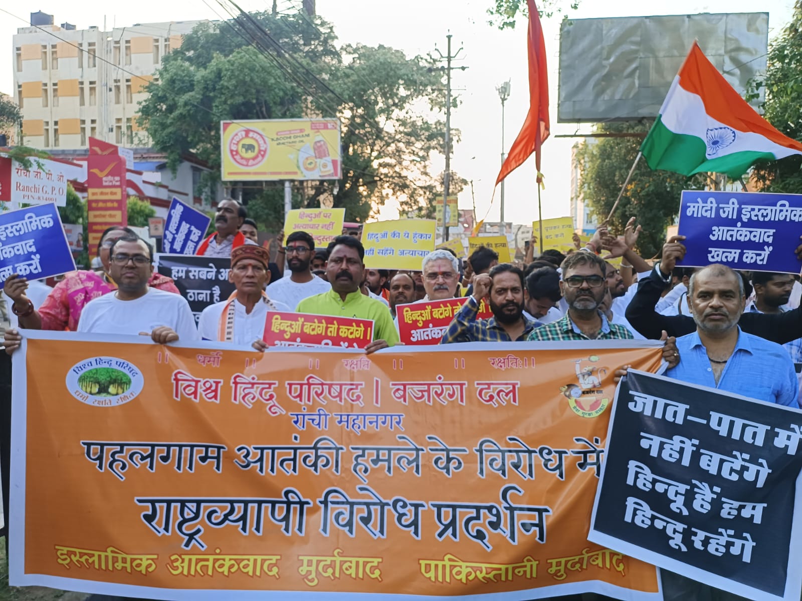 आक्रोश प्रदर्शन करते हुए सभी लोग जिला स्कूल मैदान से अल्बर्ट एक्का चौक गए। सभी लोग पाकिस्तान मुर्दाबाद, पाकिस्तान होश में आओ, देश के गद्दारों को-गोली मारो सालों को, जय श्री राम, भारत माता की जय, संघर्ष नहीं अब रण होगा-संग्राम महाभीषण होगा आदि के नारे लगा रहे थे। तथा सभी हाथ में तख्ती लिए चल रहे थे जहां पाकिस्तान मुर्दाबाद आदि लिखे थे।