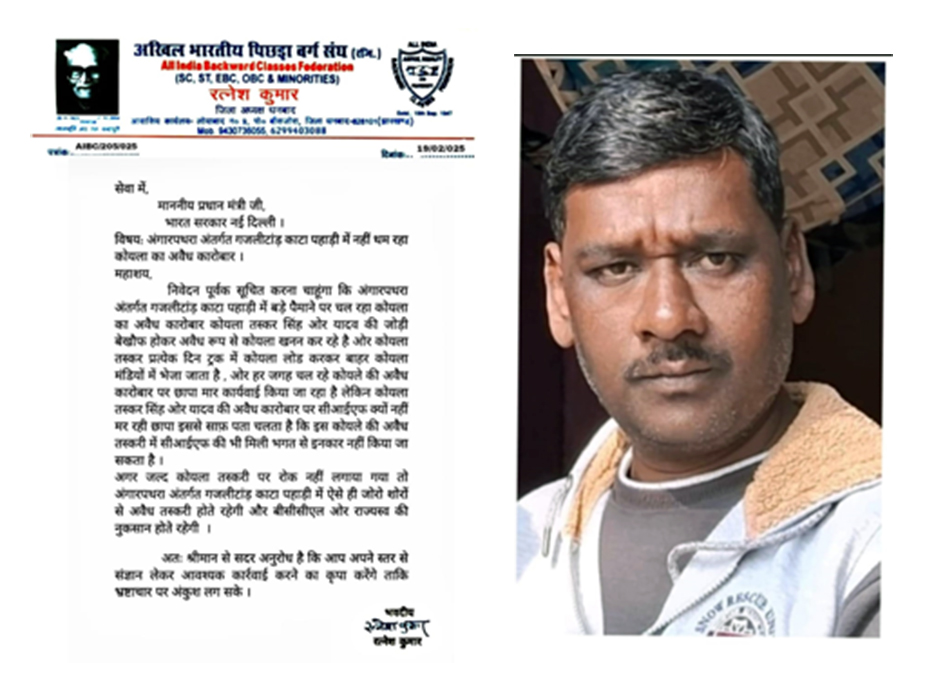 एबीएन न्यूज नेटवर्क, धनबाद/ रांची। अखिल भारतीय पिछड़ा वर्ग संघ के जिलाध्यक्ष रत्नेश कुमार ने प्रधानमंत्री को पत्र लिखकर कहा कि अंगारपथरा अंतर्गत गजलीटांड़ काटा पहाड़ी में बड़े पैमाने पर चल रहा कोयला का अवैध कारोबार पर रोक लगाने की मांग की है। उन्होंने कहा कि कोयला तस्कर सिंह ओर यादव की जोड़ी बेखौफ होकर अवैध रूप से कोयला खनन कर रहे है।