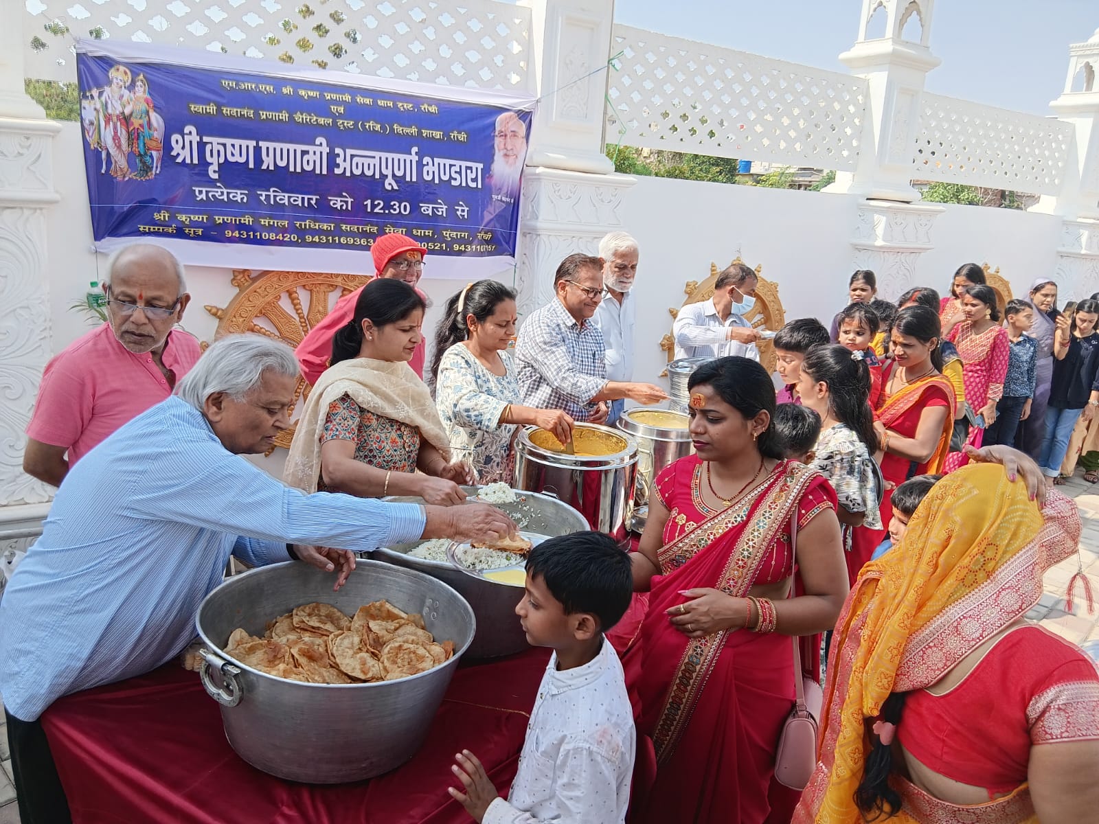 श्री कृष्ण प्रणामी सेवा धाम ट्रस्ट द्वारा संचालित पुंदाग मे श्री कृष्ण प्रणामी मंगल राधिका सदानंद सेवा धाम में 196 वाँ श्री कृष्ण प्रणामी अन्नपूर्णा सेवा महाप्रसाद का आयोजन किया गया है। ट्रस्ट की वरिष्ठ सदस्य मीरा अडूकिया ओमप्रकाश अडूकिया एवं उनके परिवार के सौजन्य से तथा श्री कृष्ण प्रणामी के सदस्यों के द्वारा अन्नपूर्णा महाप्रसाद भंडारे में आज पूड़ी- आलू चना टमाटर मिश्रित सब्जी, केसरिया खीर, वेजिटेबल पुलाव का वितरण किया गया। अन्नपूर्णा महाप्रसाद 2500 से भी अधिक श्रद्धालुओं ने ग्रहण किया। अन्नपूर्णा महाप्रसाद का विधिवत भोग पुजारी अरविंद पांडे द्वारा लगाया गया। तत्पश्चात भजन संकीर्तन का आयोजन हुआ। भजन गायक मनीष सोनी एवं निर्मल जालान ने अपने मनमोहक सुमधुर भजनों की अमृत गंगा का रसपान कराते हुए श्रोताओं को खूब झुमाया। तथा पूरा वातावरण को कृष्णमय एवं भक्तिमय बना दिया। गुरु महाराज की जन सेवा को समर्पित जीवन के स्वर्णिम 53 वर्ष पूरे होने उपलक्ष्य में एवं परमहंस डॉ.संत सदानंद महाराज के शिष्यों ने आज ट्रस्ट के अध्यक्ष डूंगरमल अग्रवाल उपाध्यक्ष निर्मल जालान एवं राजेंद्र प्रसाद अग्रवाल की देखरेख में जरूरतमंदों अभावग्रस्त ग्रामीणों एवं मंदिर के आसपास रहने वाले श्रद्धालुओं को भोजन कराकर एवं उपयोगी सामग्री देकर सेवा की गई। ट्रस्ट के प्रवक्ता सह मीडिया प्रभारी संजय सर्राफ ने बताया कि संस्था द्वारा श्री कृष्ण प्रणामी सेवा धाम श्री राधा कृष्ण मंदिर परिसर मे आज 196 वें अन्नपूर्णा सेवा महाप्रसाद का आयोजन था।आज सुबह से ही श्रद्धालुओं का तांता लगा रहा। तथा भगवान श्री राधा कृष्ण मंदिर मे लगभग 5 हजार से भी अधिक श्रद्धालुओं ने दर्शन किए। इस अवसर पर- डुंगरमल अग्रवाल, निर्मल जालान, राजेंद्र प्रसाद अग्रवाल,सुरेश चौधरी,पूरणमल सर्राफ,नन्द किशोर चौधरी,विशाल जालान ,सुरेश भगत,ओम प्रकाश सरावगी,सुरेश अग्रवाल,मधु जाजोदिया, विजय अग्रवाल, विष्णु सोनी,मनीष सोनी, नंदकिशोर चौधरी, पवन पोद्दार,शिव भगवान अग्रवाल, सुनीता अग्रवाल,अमिता जालान,अग्रवाल,शोभा जालान, सुनिता पुरोहित,ज्ञान प्रकाश शर्मा, परमेश्वर साहू, धीरज कुमार गुप्ता, महेश वर्मा, चन्द्रदीप साहु,हरीश कुमार,अशोक ठाकुर सहित बड़ी संख्या में महिलाएं, पुरुष उपस्थित थे।