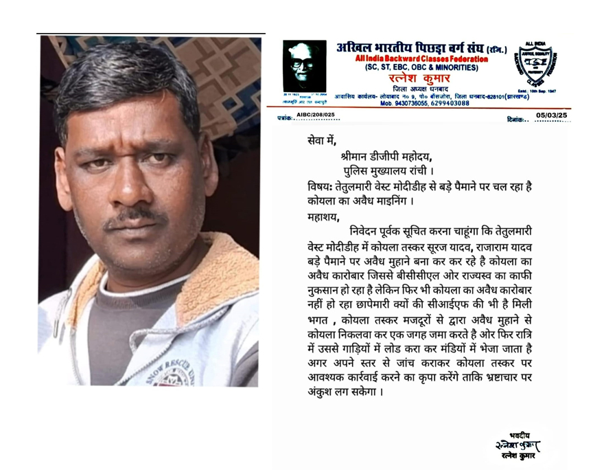 एबीएन न्यूज नेटवर्क, धनबाद/ रांची। अखिल भारतीय पिछड़ा वर्ग संघ के जिलाध्यक्ष रत्नेश कुमार ने झारखंड डीजीपी को पत्र लिखकर कहा है कि तेतुलमारी वेस्ट मोदीडीह में कोयला तस्कर सूरज यादव, राजाराम यादव बड़े पैमाने पर अवैध मुहाने बना कर कर रहे हैं। कोयला का अवैध कारोबार से बीसीसीएल और राज्यस्व का काफी नुकसान हो रहा है। लेकिन फिर भी कोयला का अवैध कारोबार नहीं रूक रहा है।