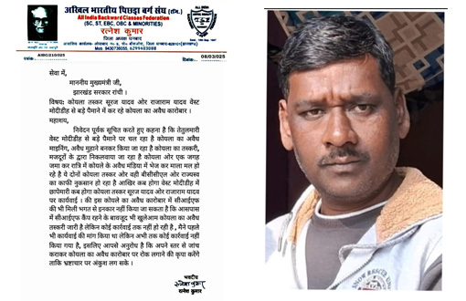 एबीएन न्यूज नेटवर्क, धनबाद/ रांची। अखिल भारतीय पिछड़ा वर्ग संघ के जिलाध्यक्ष रत्नेश कुमार ने मुख्यमंत्री को पत्र लिखकर कहा है कि तेतुलमारी वेस्ट मोदीडीह से बड़े पैमाने पर कोयला की अवैध माइनिंग की जा रही है। इसके लिए कई अवैध मुहाने बनाये गये हैं। मजदूरों के द्वारा कोयला निकलवाकर एक जगह जमा कर रात्रि में कोयले की अवैध मंडियों में भेज कर मालामल हो रहे हैं।