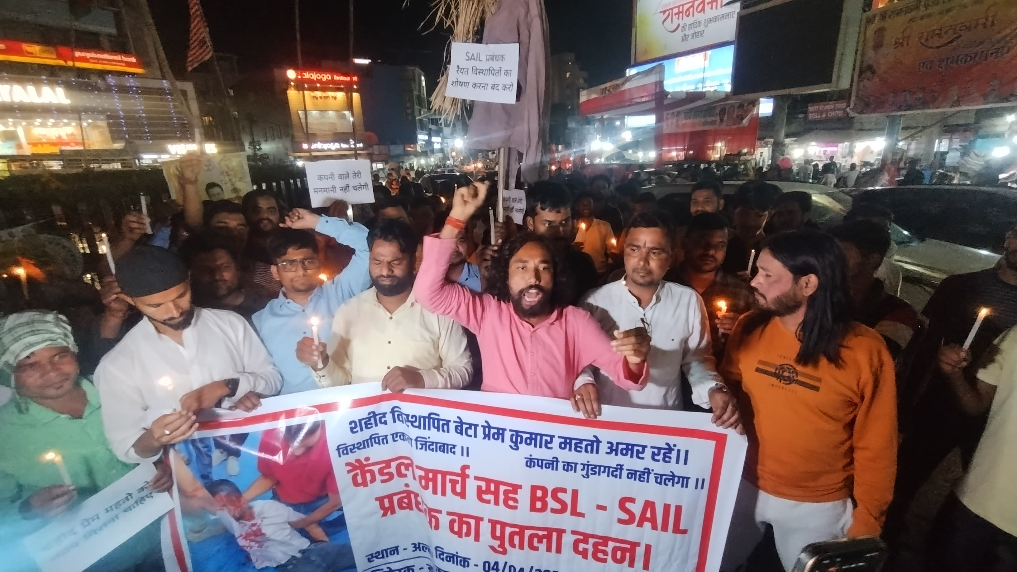 एबीएन न्यूज नेटवर्क, बोकारो। बोकारो स्टील लिमिटेड कंपनी एडीएम मुख्य द्वार पर विस्थापित आपरेटिंस संघ के द्वारा नौकरी की मांग को लेकर आंदोलन के दौरान सरकारी लाठी से विस्थापित बेटा प्रेम कुमार महतो का आंदोलन स्थल से मौत का मामला संपूर्ण झारखंड में तूल पकड़ता जा रहा है। रांची में झारखंड लोकतांत्रिक क्रांतिकारी मोर्चा के केंद्रीय वरीय उपाध्यक्ष आंदोलनकारी नेता देवेन्द्र नाथ महतो के नेतृत्व में अल्बर्ट एक्का चौक पर कैंडल मार्च सह बीएसएल महाप्रबंधक का पुतला दहन किया गया।