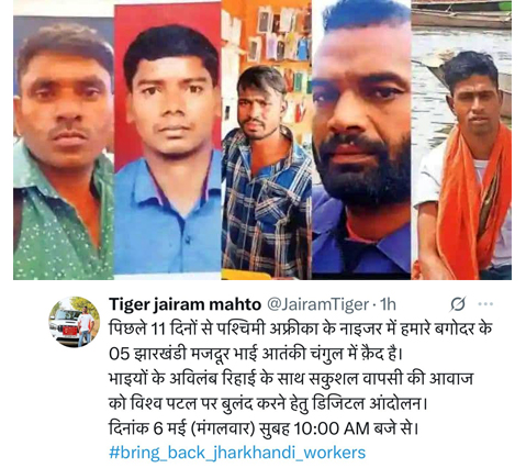 बताते चलें कि नाइजर देश में पांच झारखंडी श्रमिकों को केपीटिएल ट्रांसमिशन कंपनी कार्यस्थल से हथियारबंद आतंकी संगठन के द्वारा अपहरण करने की खबर है। इसे लेकर राज्य के प्रवासी मजदूर उत्तम महतो, चंद्रिका महतो, संजय महतो, फजीत महतो एवं राजू महतो के परिवारों में नाराजगी का स्थिति बना हुआ है। और सरकार से सुरक्षा की अपील की जा रही है।