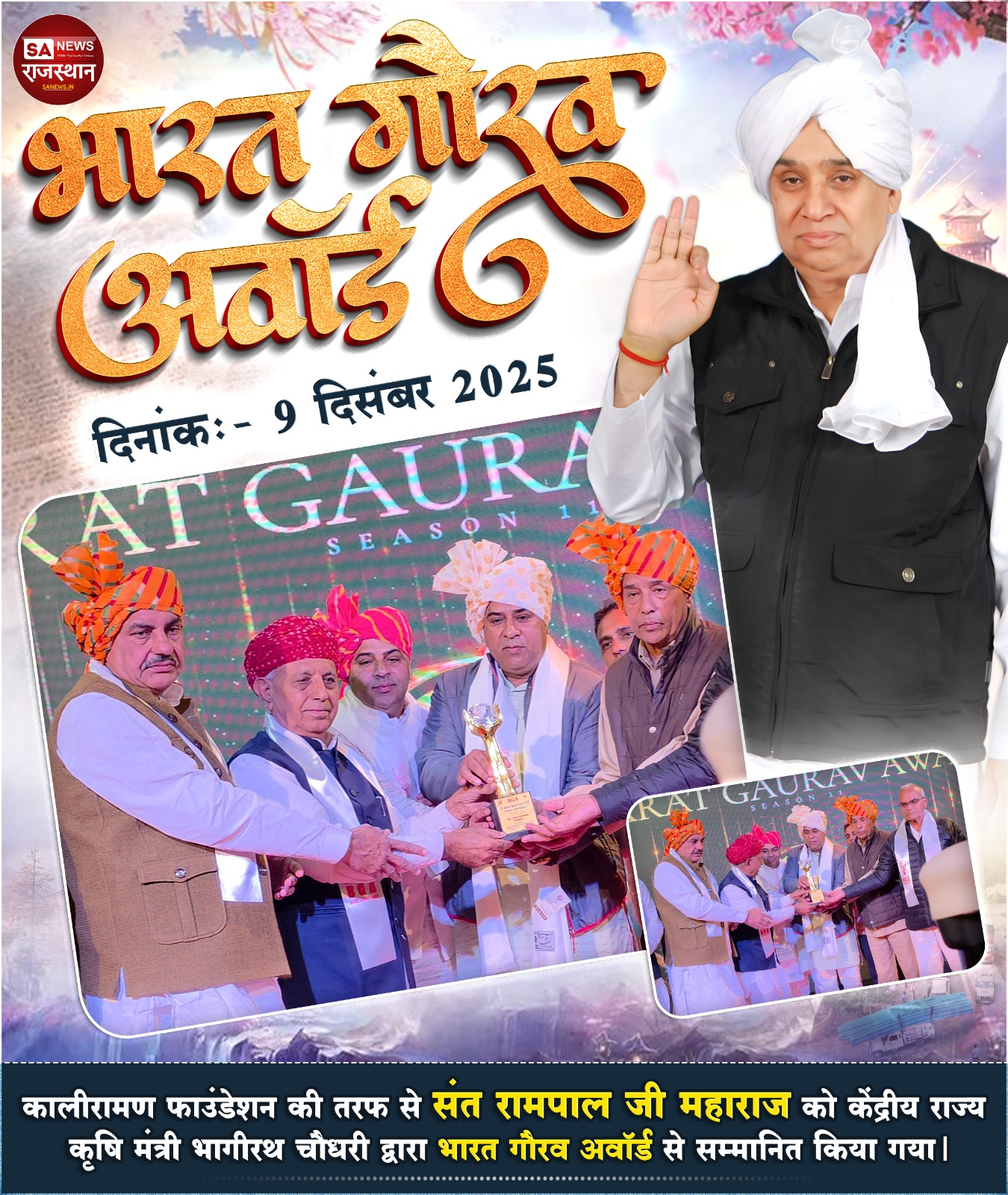 एबीएन सेंट्रल डेस्क (नई दिल्ली)। कालीरामण फाउंडेशन द्वारा आयोजित एक समारोह में, संत रामपाल जी महाराज को भारत गौरव अवॉर्ड से सम्मानित किया गया है। यह प्रतिष्ठित सम्मान उन्हें भारत सरकार के केंद्रीय राज्य कृषि मंत्री, भागीरथ चौधरी के कर कमलों द्वारा प्रदान किया गया।