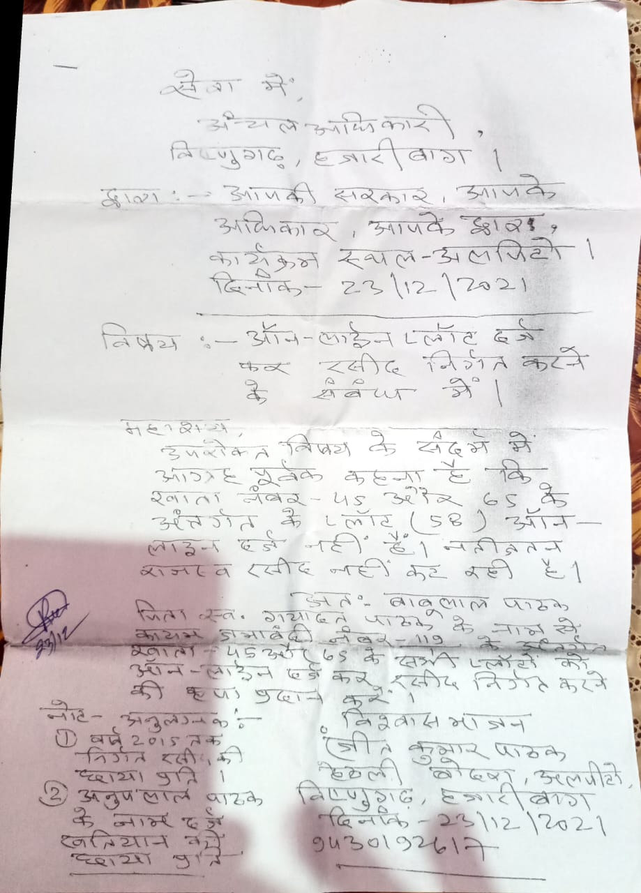 टीम एबीएन, विष्णुगढ़ (हजारीबाग)। आपकी सरकार आपके द्वार कार्यक्रम झारखंड सरकार के कार्यकाल के 2 वर्ष पूरे होने पर बीते वर्ष पंचायतों में शिविर के माध्यम से जन-जन तक अधिकारों के तहत आवेदकों के आवेदन पर ऑन द स्पॉट विविध लाभ मुहैया कराने की मुहिम सरकार ने चलाई थी। जिसके माध्यम से बिष्णुगढ़ प्रखंड प्रक्षेत्र में पूरे माह शिविर लगाया गया था। दूर-दूर से लोग अपनी समस्याओं और योजनाओं का लाभ लेने के लिए शिविर में पहुंचे थे। कई लोगों को इसका लाभ मिला भी होगा। कई बैरंग लौट गये थे, जिसमें से एक आवेदक प्रखंड के अलपीटो पंचायत में बीते वर्ष शिविर के बाबत खाता प्लॉट को ऑनलाइन कर राशिद निर्गत करने के लिए आवेदन समर्पित किया थे। पर 1 वर्ष बाद भी अंचल ने खाता प्लॉट का ऑनलाइन किया और न ही रसीद निर्गत की। मामले पर सीओ का कहना है कि बकाश्त जमीन को सरकार अपनी जमीन समझती है, जिसका रेंट एसेसमेंट कराना जरूरी है। रेंट एसेसमेंट के बाद खाता प्लॉट को ऑनलाइन किया जायेगा व रसीद निर्गत की जायेगी। बता दें कि बकाश्त भूमि का रेंट पूर्व से भुगतेय है व विभाग द्वारा ऑफलाइन रसीद निर्गत है। पुनः रेंट एसेसमेंट का नियम रैयत के समझ से परे है। पुनः सरकार के 3 वर्ष के कार्यकाल पूरे होने के उपलक्ष पर सरकार आपके द्वार कार्यक्रम के तहत शिविर का आयोजन किया जा रहा है। देखना दिलचस्प होगा की झारखंड सरकार के लोक हित वाली कार्यक्रम इस बार कितनी रंग लाती है या आवेदकों के आवेदन को यूं ही अधर में छोड़ दिया जायेगा।