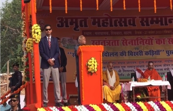 इसके पूर्व, डॉ भागवत ने शहीद श्री नारायण सिंह की प्रतिमा का अनावरण किया और पत्रकार रविन्द्र कुमार की पुस्तक आंदोलन की बिखरी कड़ियां का विमोचन किया। कार्यक्रम में सारण सहित राज्य के कई जिलों से आए लगभग 350 स्वतंत्रता सेनानियों के परिजनों को सम्मानित किया गया। मौके पर केंद्रीय गृह राज्यमंत्री नित्यानंद राय, भाजपा प्रदेश अध्यक्ष संजय जयसवाल, छपरा सांसद राजीव प्रताप रूड़ी और महाराजगंज सांसद जनार्दन सिंह सीग्रीवाल समेत कई प्रमुख लोग उपस्थित थे।
