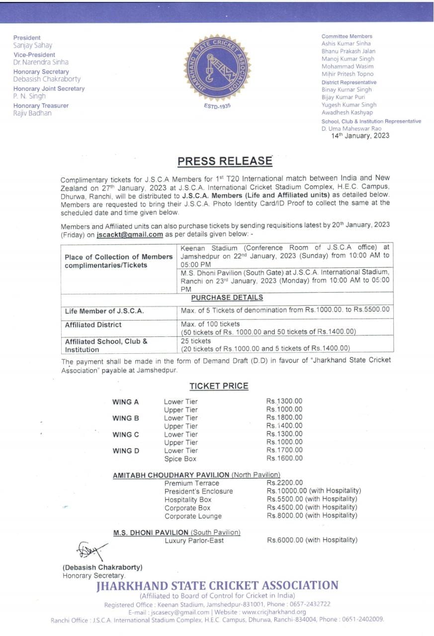 एबीएन स्पोर्ट्स डेस्क। भारत और न्यूजीलैंड के बीच जेएससीए इंटरनेशनल क्रिकेट स्टेडियम में 27 जनवरी 2023 को खेले जाने टी-20 मैच के सबसे सस्ते टिकट का दाम 1 हज़ार और महंगा टिकट 10 हज़ार का होगा। झारखंड क्रिकेट एसोसिएशन ने टिकट के रेट जारी कर दिये।