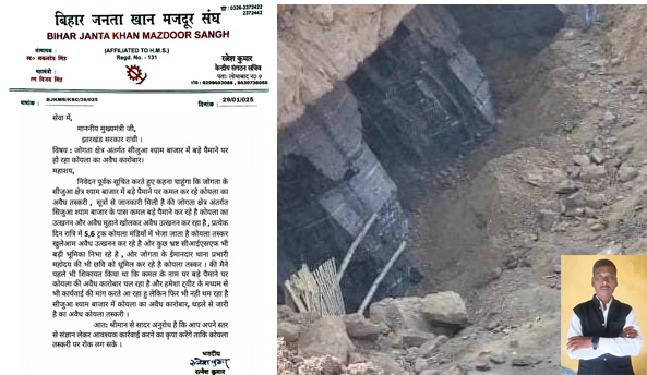 एबीएन न्यूज नेटवर्क, धनबाद/ रांची। बिहार जनता खान मजदूर संघ के केंद्रीय संगठन सचिव रत्नेश कुमार ने मुख्यमंत्री को पत्र लिखकर कहा कि जोगता के सीजुआ क्षेत्र श्याम बाजार में बड़े पैमाने पर कमल कोयला का अवैध तस्करी कर रहा है।