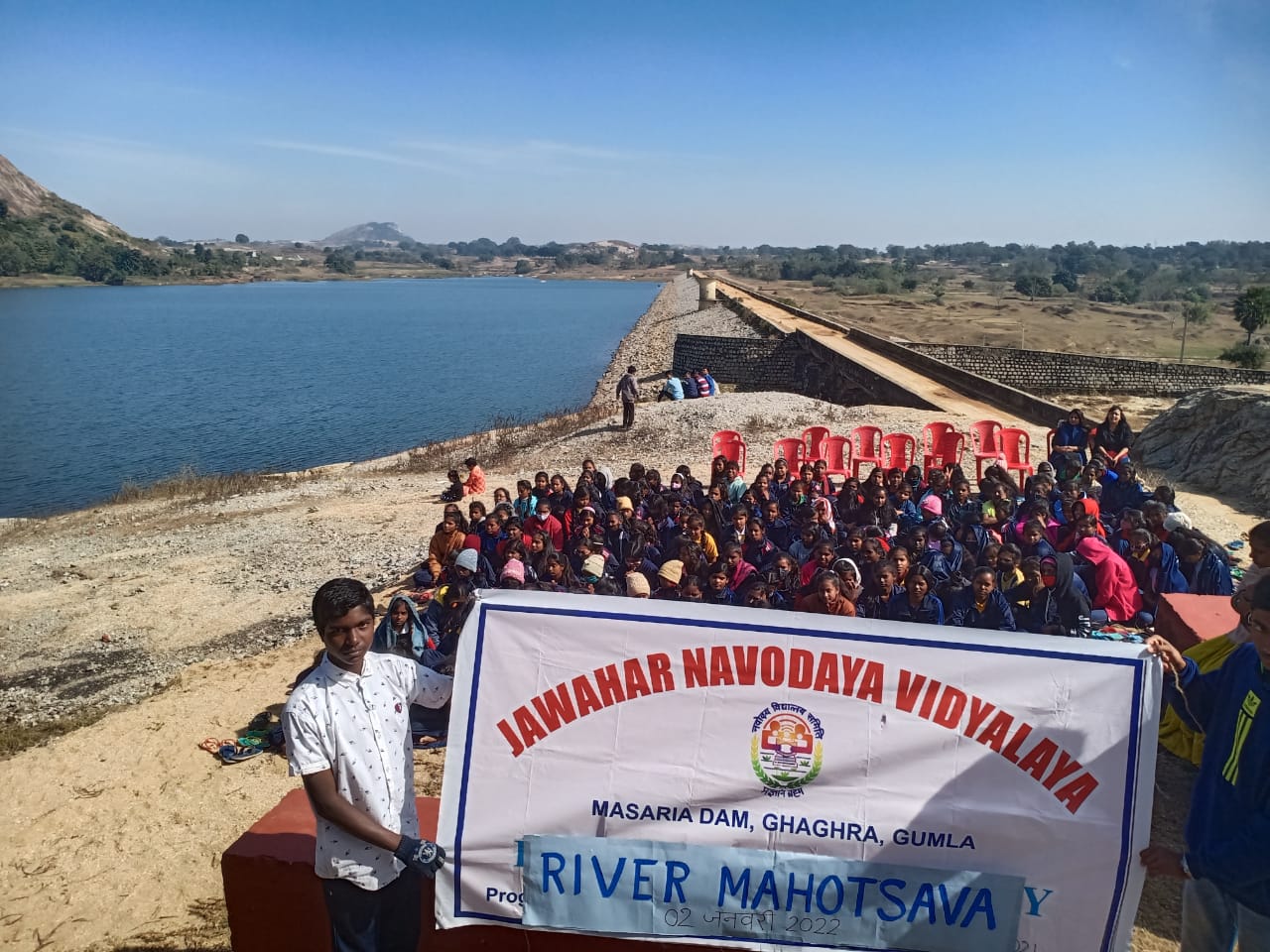 टीम एबीएन, गुमला। जवाहर नवोदय विद्यालय गुमला (झारखंड) प्रखण्ड घाघरा स्थित मसरिया बांध में आज दिनांक 2 जनवरी 2022 दिन रविवार को "नदी महोत्सव कार्यक्रम" के अंतर्गत जवाहर नवोदय विद्यालय के सभी बच्चों को विद्यालय के प्राचार्य डॉ विश्वनाथ खिल्लर के निर्देशानुसार बच्चों को पीछे स्थित मसरिया बांध पर भ्रमण कराया गया। जिसमें बच्चों को नदी की उपयोगिता के साथ-साथ जल के महत्व, जल संचय तथा भविष्य में होने वाले जल संकट के बारे में उन्हें भलीभांति अवगत कराया गया। इसके साथ ही बच्चों ने प्रकृति की गोद में स्थित भव्य मसारिया पहाड़ और आए हुए विदेशी साइबेरियन पक्षियों का भी निरीक्षण किया तथा अन्य पर्यटकों के साथ प्रकृति की सुंदरता का भी आनंद लिया। मौके पर मसरिया बांध स्थित श्री हनुमान जी के मंदिर में विद्यालय के छात्र-छात्राओं ने पूजन, गंगा आरती, साफ-सफाई और भजन गायन कार्यक्रम भी किया। मौके पर विद्यालय के प्राचार्य के साथ समस्त छात्र-छात्राएं, शिक्षकगण और सभी कर्मचारी उपस्थित रहे।