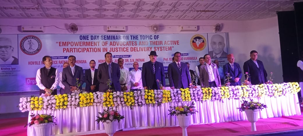टीम एबीएन, हजारीबाग। बार एसोसिएशन हजारीबाग और इंडियन एसोसिएशन आफ लॉयर के संयुक्त तत्वावधान में अधिवक्ताओं का एक दिवसीय सेमीनार शनिवार को स्थानीय नगर भवन में आयोजित किया गया। बतौर मुख्य अतिथि झारखंड उच्च न्यायालय के न्यायाधीश रत्नाकर भेंगरा, न्यायाधीश डॉ एसएन पाठक, नेशनल यूनिवर्सिटी के कुलपति डॉ केशवा राव वराकुला, विशिष्ट अतिथि स्टेट बार कॉउंसिल के सदस्य अब्दुल कलाम रसिदी हजारीबाग बार संघ के अध्यक्ष और झारखंड बार कौंसिल सदस्य राज कुमार राजू, उपाध्यक्ष भैया संजय सिन्हा, महासचिव सुमन सिंह, जॉइंट सेक्रेटरी प्रमोद सिंह, कोषाध्यक्ष भरत कुमार, इंडियन एसोसिएशन आॅफ लॉयर के जिला अध्यक्ष गुलाम जिलानी सचिव संभु प्रसाद, कौलेश्वर कुषवाहा ने संयुक्त रूप से दीप प्रज्ज्वलित कर कार्यक्रम का शुभारंभ किया। सेमिनार को संबोधित करते हुए न्यायाधीष रत्नाकर भेंगरा ने कहा कि अधिवक्ता समाज को सुदृ़ढ़ करने में अहम भूमिका होता है। वे अपने दायित्वों का ईमानदारी पूर्वक निर्वाहन करें। वे अपने कॉलेज के समय को याद करते हुए अपना अनुभव अधिवक्ताओं से साझा किया और कहा कि नए अधिवक्ताओ को मेहनत करते रहना चाहिए। न्यायाधीश डॉ एसएन पाठक ने कहा कि बार और बेंच न्याय पद्धति के दो पहिए है। राष्ट्र निर्माण में अधिवक्ता की भूमिका अहम है। उन्होंने कहा कि स्वतंत्रता संग्राम में महान स्वतंत्रता सेनानी महात्मा गांधी, डॉ राजेंद्र प्रसाद, जवाहर लाल नेहरू, डॉ भीमराव अंबेडकर आदि भी एक अधिवक्ता थे। जिनकी वजह से हमे आजादी मिली है। न्यायालय में अधिवक्ताओं की दलिल से ही किसी को न्याय मिलता है। नेशनल लॉ यूनिवर्सिटी के कुलपति केआर वराकुल्ला ने सभा को संबोधित करते हुए कहा कि अधिवक्ताओं को अपने आत्मविश्वास को सशक्त बनाने की आवश्यकता है तभी वो बाहरी रूप से शशक्त हो पायेंगे। साथ ही उन्होंने कहा कि अधिवक्ता अपने बौद्धिक व आंतरिक शक्ति का विकास करें तभी व एक सफल अधिवक्ता बन सकते हैं। बार संघ अध्यक्ष राज कुमार राजू ने अपने संबोधन में कहा कि बार और बेंच को साथ मे करना होगा भी समाज का विकास और सही न्याय मिल सके। स्वागत भाषण महासचिव सुमन सिंह, धन्यवाद ज्ञापन गुलाम जिलानी व मंच संचालन युवा अधिवक्ता पूजा कश्यप ने किया। सभी अतिथियों को हजारीबाग बार संघ ने अंग वस्त्र और मोमेंटो दे कर सम्मानित किया। सेमिनार के दूसरे सत्र में सभी नए अधिवक्ताओं के लिए वर्कशॉप कराया गया जिसमें कानूनी सलाह और प्रश्न उत्तर किया गया। दूसरे सत्र में अध्यक्ष राज कुमार राजू, उपाध्यक्ष भैया संजय कुमार सिन्हा, ए के रशीदी, गुलाम जिलानी, प्रमोद कुमार सिंह मौजूद थे। सेमिनार को सफल बनाने में हजारीबाग बार संघ, इंडियन एसोसिएशन आॅफ लॉयर, अधिवक्ता दीपसिखा, अध