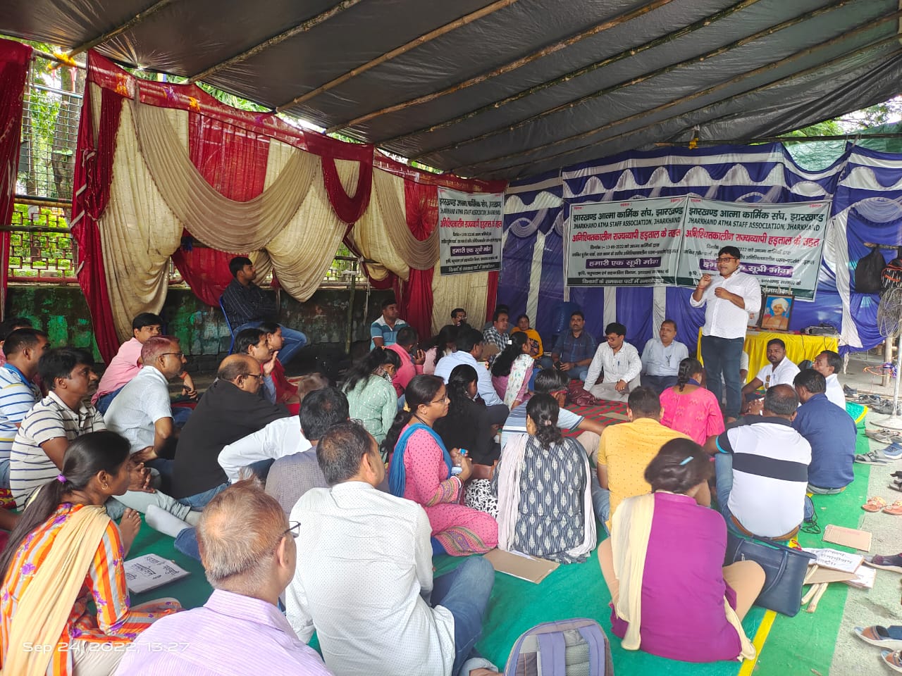 टीम एबीएन, रांची। आज राजभवन के पास झारखंड आत्मा कार्मिक संघ के तत्वावधान में राज्य के सभी जिलों से आये हुए सभी आत्मा कर्मी अनिश्चितकालीन हड़ताल पर डटे रहे। 13 दिनों से लगातार अपनी एक सूत्री मांगों को लेकर संघर्ष कर रहे हैं, लेकिन अभी तक कोई ठोस पहल सरकार ने नहीं किया है। संघ के अध्यक्ष मोतीलाल रजक ने बताया कि कल समिति निदेशक महोदय के आमंत्रण पर संघ के 12 सदस्यीय टीम उनके कार्यालय में हमलोगों की मांगों पर विस्तृत विचार विमर्श हुआ।निदेशक ने बताया कि आपकी संचिका आगे आपलोगो के पक्ष में सकारात्मक तरीके से लिख कर आगे करवाई के लिए बड़ा दिया गया है। उन्होंने अपना मंतव्य भी दिया कि किसान हितों को ध्यान में रखते हुए अपनी हड़ताल में कुछ लचीलापन लायें। संघ के उपाध्यक्ष ने बताया कि हमलोग लंबे समय से कृषि विभाग और समकक्ष विभागों का काम किसानों के हित में करते रहते हैं।अभी भी किसानों का काम पूरे मन से करना चाहते हैं। लेकिन जब तक हमारी समायोजन की संचिका कैबिनेट तक नहीं पहुंचता है अनिश्चितकालीन हड़ताल चलता रहेगा। अतः हम चाहते है की हमारी संचिका किसान की हीतो को देखते हुए अति शीघ्र कैवनेट तक पहुंचाने मे सहयोग करे ताकि अनिश्चित कालीन हड़ताल पर विचार करने के लिए निर्णय लिया जा सके।आज परियोजना निदेशक, अप परियोजना निदेशक, लेखापाल, लिपिक, कम्प्यूटर ऑपरेटर, अनुसेवक, रात्रि प्रहरी, प्रखंड तकनीकी प्रबंधक, सहायक तकनीकी प्रबंधक ने राजभवन पर चल रहे धरना को संबोधित किया और बताया की संचिका कैबिनेट में पहुंचने के बाद ही हड़ताल के बारे मे विचार किया जाय इस बार नहीं, तो कभी नहीं का संदेश सभी आत्मा कर्मियों को दिया। धरना स्थल पर संयोजक सुधीर कुमार, कोषाध्यक्ष अंजीव कुमार श्रीवास्तव, मीडिया प्रभारी शिव नारायण गोप और सभी आत्मा कर्मी उपस्थित रहे।