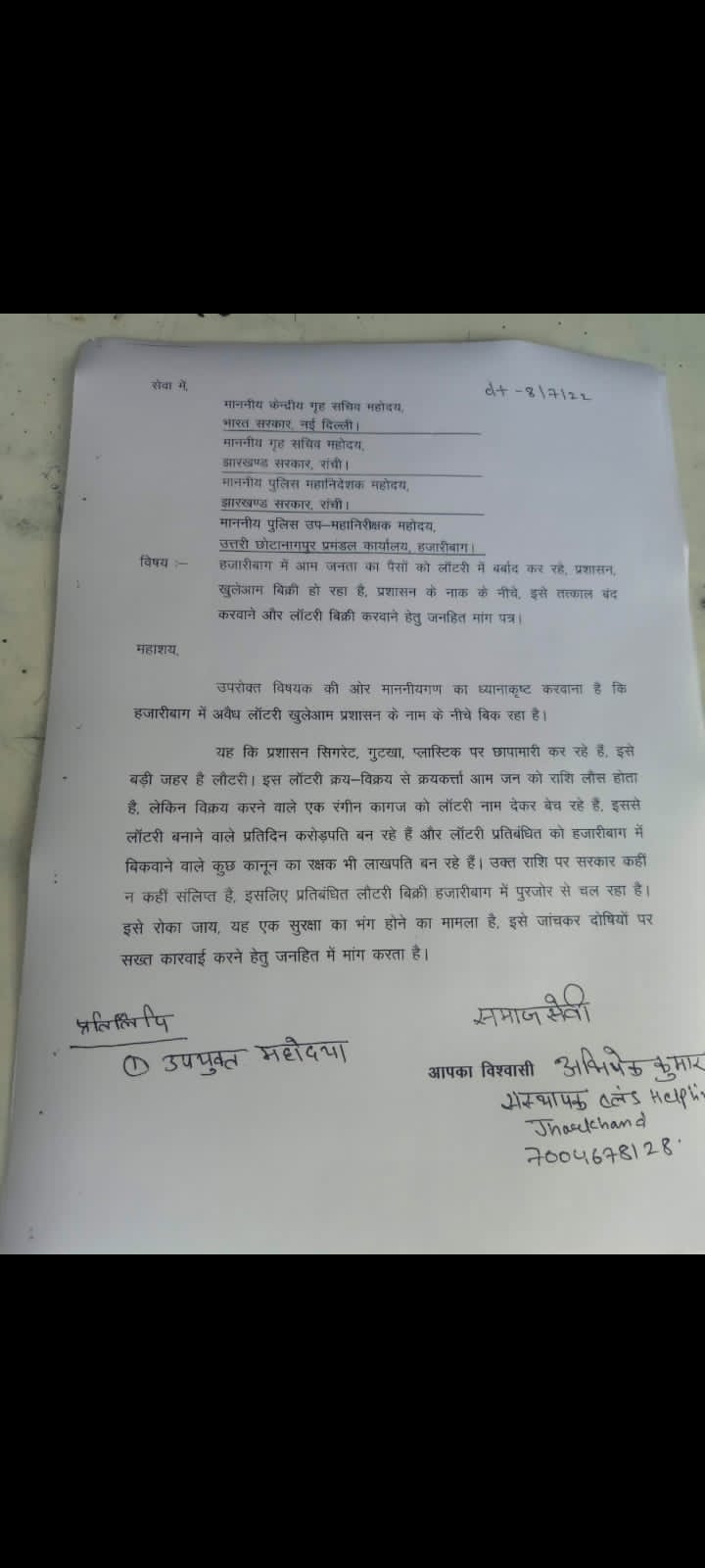टीम एबीएन, हजारीबाग। प्रतिबंध के बावजूद जिले में अवैध लॉटरी का धंधा फल-फूल रहा है। सदर थाना क्षेत्र में भी कई लोग अवैध लॉटरी का कारोबार कर रहे हैं। लॉटरी माफिया के सामने जिला प्रशासन बेबस नजर आ रही है। जानकारी के बावजूद अवैध लॉटरी का खेल रोकने में इनकी दिलचस्पी नहीं है। इस गोरखधंधे के जरिए लोगों को मालामाल करने का लालच दिया जा रहा है। भोले-भाले लोगों को इस कारोबार में फंसाया जा रहा है। खासकर निर्धन तबके व युवा वर्ग को मामूली हिस्से का लालच देकर धंधा कराया जा रहा है। इससे न केवल सरकार को राजस्व का नुकसान हो रहा है, बल्कि लोग अपनी गाढ़ी कमाई को भी गंवा रहे हैं। चंद मिनटों में करोड़पति बनने के लालच में लोग लॉटरी की खरीदारी कर रहे हैं। लेकिन पुलिस प्रशासन का इस ओर ध्यान नहीं जा रहा है। खुलेआम चल रहा धंधा : जिला मुख्यालय में यह गोरखधंधा खुलेआम चल रहा है। सूत्र बताते हैं कि इस गोरखधंधे से जुड़े कारोबारी खुद करोड़पति बन चुके हैं। जबकि लॉटरी खरीदने वाले लोग मेहनत की गाढ़ी कमाई गंवा रहे हैं। खासकर रिक्शा चालक, फुटपाथी दुकानदार व युवा इन कारोबारियों की जाल में आसानी से फंस रहे हैं। नहीं हो रही कार्रवाई : इस मामले पर समाजसेवी अभिषेक कुमार कहते है कि 8 जुलाई को उन्होंने जिले के उपायुक्त के नाम से केंद्रीय गृह सचिव भारत सरकार, गृह सचिव झारखण्ड सरकार, पुलिस उप महानिरीक्षक, छोटानागपुर प्रमंडल हजारीबाग के नाम से आवेदन दिया था। यहां तक की वे खुद लॉटरी के रोकथाम को लेकर आयुक्त से मिले थे। बताया कि आयुक्त ने मेरे कार्य की सराहना करते हुए इसके रोकथाम हेतु उचित कार्रवाई की बात की थी, मगर आज तक कुछ नहीं हुआ। यहां तक कि अधिकारियों को ये तक जानकारी दे दी की लॉटरी कहां-कहा बेची जा रही है, इसकी लोकेशन तक बता दी थी लेकिन कोई कार्रवाई नहीं की गयी। इससे तो यही पता चलता है कि लॉटरी माफिया की जड़ें काफी मजबूत हैं।