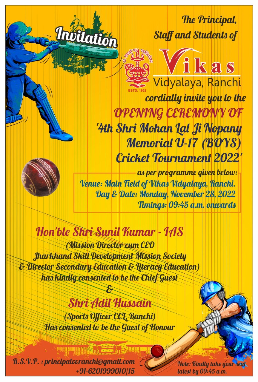 टीम एबीएन, रांची। विकास विद्यालय रांची में मोहन लाल मेमोरियल अंडर 17 क्रिकेट टूर्नामेंट 2022 का आयोजित किया जा रहा है। विकास विद्यालय के प्रांगण में आयोजित इस खेल प्रतियोगिता का शुभारंभ कल होगा। आइएएस अधिकारी सुनील कुमार इसका उद्घाटन करेंगे। यह समारोह विकास विद्यालय के प्रांगण में प्रात: नौ बजकर 45 मिनट पर आंरभ होगा। इस अवसर पर प्राचार्य पीए कालरा सहित स्कूल के सभी शिक्षक और प्रबंधन के लोग उपस्थित रहेंगे।