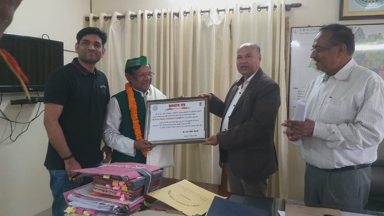 टीम एबीएन, पलामू/ रांची। प्रमंडलीय आयुक्त जटा शंकर चौधरी ने आज पर्यावरणविद् कौशल किशोर जायसवाल को प्रशस्ति पत्र एवं शॉल ओढ़ाकर सम्मानित किया और उनके कार्यों की सराहना की। कौशल किशोर जायसवाल को वनों पर रक्षाबंधन अभियान, पर्यावरण धर्म का संचालन एवं पर्यावरण संरक्षण के क्षेत्र में पिछले 56 वर्षों से किये गये उत्कृष्ट एवं सराहनीय कार्य के लिए यह सम्मान प्रदान किया गया।