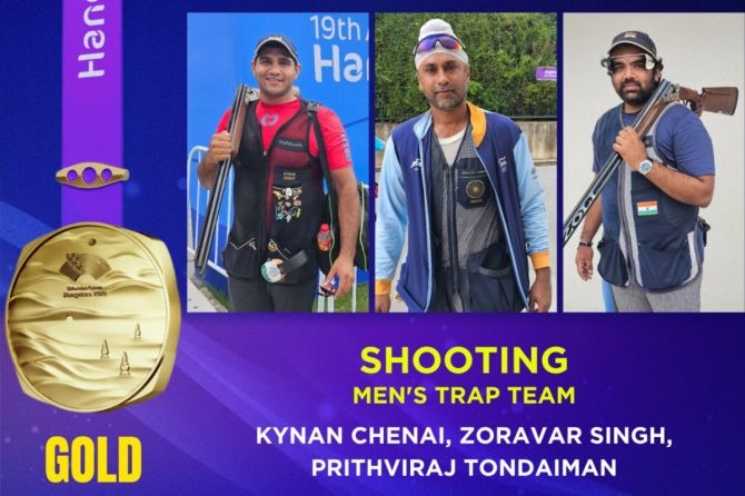 किनान चेनाई, जोरावर सिंह और पृथ्वीराज टोंडिमान की पुरुष ट्रैप टीम ने एशियाई खेलों में रिकॉर्ड तोड़ते हुए स्वर्ण जीता। तीनों ने मिलकर कुवैत और चीन की टीमों को हराया। किनान चेनाई, जोरावर सिंह और पृथ्वीराज टोंडिमान ने 361 का स्कोर किया और स्वर्ण पदक जीता।