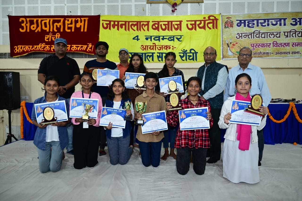 टीम एबीएन, रांची। अग्रवाल सभा के तत्वाधान में 4 नवंबर 2023 को जमनालाल बजाज जयंती के अवसर पर महाराजा अग्रसेन भवन में रांची के लगभग 70 सरकारी एवं निजी पब्लिक स्कूलों के 95 बच्चों को चित्रकला प्रतियोगिता एवं जस्ट मिनट भाषण प्रतियोगिता में उत्कृष्ट प्रदर्शन हेतु प्रस्तुत किया गया।