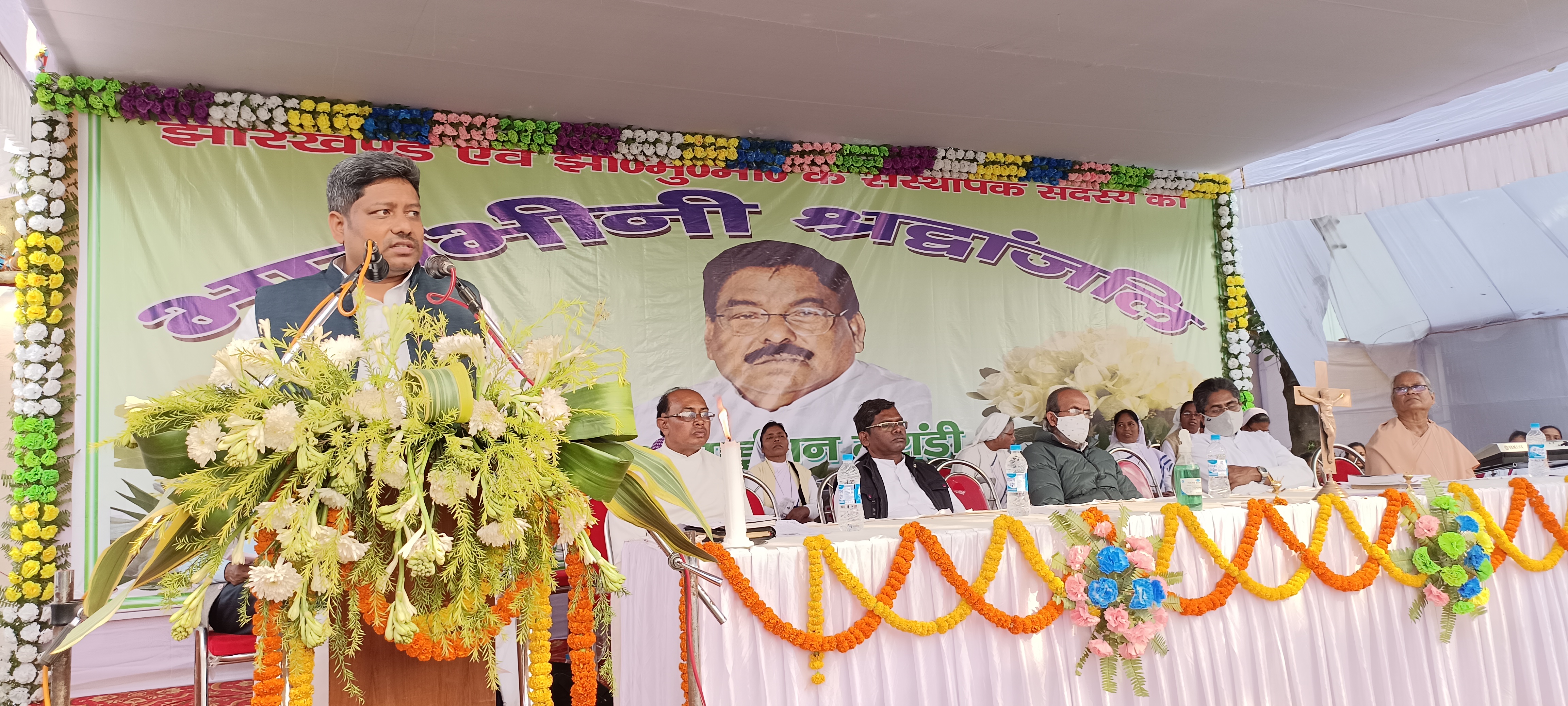 हिरणपुर (पाकुड़)। झामुमो के संस्थापक सह पूर्व मंत्री साइमन मरांडी की स्मृति में शुक्रवार को हिरणपुर स्थित विधायक आवास में प्रार्थना सभा हुई। जिसमें विधायक दिनेश मरांडी, शिकारीपाड़ा विधायक नलिन सोरेन, स्टीफेन मरांडी महेशपुर, पूर्व विधायक अमित महतो सिल्ली, उपायुक्त वरुण रंजन सहित हजारों की संख्या में पार्टी पदाधिकारी व कार्यकर्ताओं ने दिवंगत नेता की तस्वीर पर श्रद्धा सुमन अर्पित कर श्रद्धांजलि दी। इस दौरान दौरान दिवंगत नेता की याद में दो मिनट का मौन रखा गया। कार्यक्रम में फादर इमानुएल मुर्मू, फादर टॉमस, फादर गिल्बर्ट व फादर चार्ल्स आदि ने प्रभु यीशु की स्मरण करते हुए प्रार्थना की। वहीं उर्मिला हांसदा ने दिवंगत नेता की जीवनी को लेकर विस्तृत जानकारी दी। उनके पुत्र विधायक दिनेश मरांडी ने कहा कि पिताजी अपने राजनैतिक जीवन मे गरीबों के मसीहा के रूप में ख्यात थे। सभी वर्गों को साथ में लेकर हमेशा से चले हैं। झारखंड आंदोलन में इन्होंने अग्रिम पंक्ति में खड़ा होकर संघर्ष किया, जो काफी जानकार व दूरदर्शी थे। जनहित की समस्याओं को लेकर हमेशा से मुखर रहे। आज इन्हीं की बदौलत झामुमो में संघर्षशील कार्यकर्ताओं की जमात बनी है। मेरा दायित्व है कि सभी को लेकर चलें। उन्होंने कहा कि युवाओं को बुजुर्गों का सम्मान करना चाहिए। उनसे सीख लेनी चाहिए। पिताजी की विरासत मुझे मिली है। इस सम्मान को मैं आपसबों के सहयोग से अक्षुण्ण रखूंगा। वहीं विधायक स्टीफन मरांडी ने कहा कि दिवंगत साइमन मरांडी से मेरा राजनैतिक नहीं पारिवारिक संबंध था। छात्र जीवन से ही ये राजनीति में कूद पड़े थे। दृढ़ निश्चयी व कर्मनिष्ठ साइमन झारखंड अलग राज्य के निर्माण में महत्वपूर्ण भूमिका निभायी। जो झारखंड की राजनीति में सदा स्मरणीय रहेंगे। इसके पूर्व डुमरिया स्थित समाधि स्थल पहुंचकर विधायक दिनेश मरांडी ने दिवंगत पिता साइमन मरांडी व माता सुशीला हांसदा को पुष्पसुमन अर्पित कर श्रद्धांजलि दी व प्रार्थना सभा में भाग लिया। इस कार्यक्रम में दुमका विधायक बसंत सोरेन, झामुमो के दिग्गज विजय सिंह दुमका, डीडीसी अनमोल कुमार सिंह, विधायक पत्नी एगलिना टुडू, एसडीपीओ अजित कुमार विमल , डीएसपी नवनीत हेंब्रम, अवधेश सिंह मुख्यालय डीएसपी, डीएफओ रजनीश कुमार, डीटीओ संतोष गर्ग, जिलाध्यक्ष श्याम यादव, उपाध्यक्ष समद अली, अजीजुल इस्लाम, बरहेट विधायक प्रतिनिधि पंकज मिश्रा, इसहाक अंसारी, अशोक भगत, सर्वजीत सिंह, बीडीओ उमेश कुमार स्वांसी, संजय कुमार लिट्टीपाड़ा, सीओ मनोज कुमार, भाजपा नेता दुर्गा मरांडी आदि कई गण्यमान उपस्थित थे।