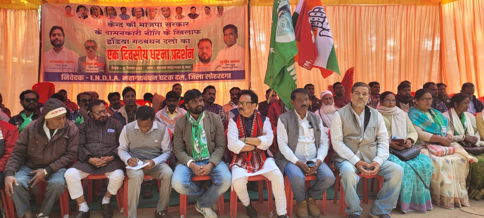 धरना प्रदर्शन में रीना भगत, मोहन दुबे, शाहिद अहमद बेलू, सदरूल अंसारी, अनिल उरांव, अजय उरांव, अफरोज आलम, सीमा परवीन, विशाल डुंगडुंग, शंभू प्रजापति, युसूफ अंसारी, मोजम्मिल अंसारी, विनय उरांव राधा तिर्की, तनवीर गौहर, जुगल उरांव, युनूस अंसारी, सददेव भगत, बालमुकुंद लोहरा, गोपाल महतो, चारो भगत, अस्मत अंसारी, एमडी कैश, सानियारो उरांव, जगदीश महतो, नागेंद्र वर्मा, यूसुफ अंसारी, शंकर उरांव, समसुल हक, रुस्तम अंसारी, काले उरांव, कबीर अंसारी, एजाज अंसारी, संगीता उरांव, समूल अंसारी, कामिल टोपनो, कमलेश राम, जफर इकबाल रौनक इकबाल, युवांती देवी, सरस्वती देवी, जिलानी अंसारी, सतीम टोप्पो, श्यामनंदन लोहरा, चैतू मुंडा, हसीब अंसारी, गंगा उरांव, धनेश्वर उरांव, गंगा जी, दुखा भगत, भीम उरांव, मीर नाहिद, संजू तूरी, वारिश अंसारी, अफरोज आलम, संतोष उरांव समेत बड़ी संख्या में इंडिया गठबंधन के लोग मौजूद थे।