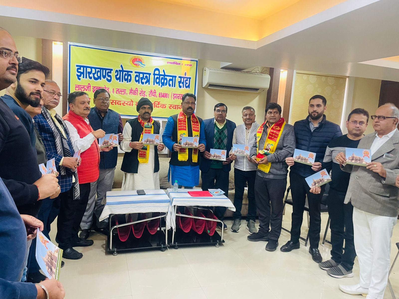थोक वस्त्र विक्रेता संघ से अध्यक्ष विक्रम खेतावत, मानद सचिव प्रमोद सारस्वत, उपाध्यक्ष अमरचंद बेगानी, सह- सचिव हैप्पी किंगर, कोषाध्यक्ष सौरभ कटारूका, पूर्व अध्यक्ष अजय बथवाल, अनिल जालान, राजेश कंदोई, विमल जैन, विक्रम जैन, ओम खेतावत, विपुल जैन, उमाशंकर कनोडिया के संग विश्व हिंदू परिषद से देवी सिंह प्रांत संगठन मंत्री, रंगनाथ महतो प्रांत सह मंत्री, राजेश अग्रवाल, मनोज पोद्दार प्रांत सहमंत्री, मिथलेश्वर मिश्र प्रांत समाजिक समरसता प्रमुख, दीपक ठाकुर प्रांत संयोजक, किशुन झा रांची विभाग मंत्री, प्रिंस अजमानी रांची विभाग संयोजक, पलामू विभाग मंत्री कुमार गौरव, रांची महानगर अध्यक्ष कैलाश केसरी, रामगढ़ मंत्री छोटू वर्मा, पलामू मंत्री दामोदर मिश्रा, संयोजक प्रताप नगर योगेश खेदवाल, संयोजक महावीर टोला, अजय राजगढ़िया सत्संग प्रमुख सहित कई लोग उपस्थित थे। उक्त जानकारी विहिप, झारखण्ड के प्रचार प्रसार प्रांत सहप्रमुख प्रकाश रंजन (93344 33338) ने एक प्रेस विज्ञप्ति जारी कर दी।