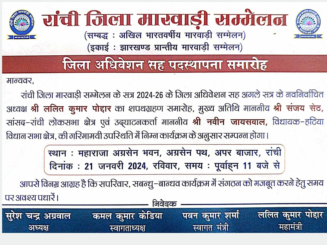 जिला मारवाड़ी सम्मेलन के अध्यक्ष सुरेश चंद्र अग्रवाल, स्वागताध्यक्ष कमल कुमार केडिया एवं स्वागत मंत्री पवन शर्मा ने संयुक्त रूप से बताया कि जिला अधिवेशन सह पदस्थापना समारोह 21 जनवरी, दिन रविवार को पूर्वाह्न 11 बजे से प्रारंभ होगा। इस समारोह में नवनिर्वाचित अध्यक्ष ललित कुमार पोद्दार रांची जिला मारवाड़ी सम्मेलन के सत्र 2024-26 के लिए अध्यक्ष पद का शपथ ग्रहण करेंगे।