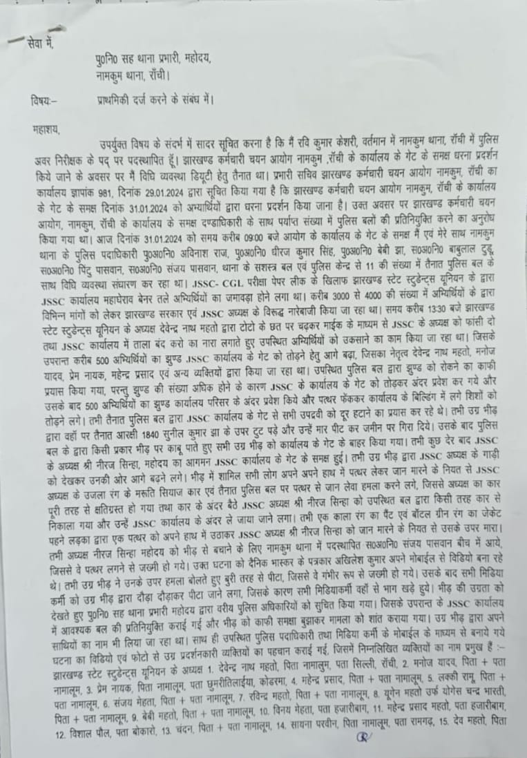टीम एबीएन, रांची। नामकुम थाना के पुलिस अवर निरीक्षक रवि कुमार केसरी द्वारा बीते 31/01/2024 को JSSC CGL का CBI जांच के मांग करने वाले छात्र नेता देवेंद्रनाथ महतो सहित कुल चार हजार (4000) छात्रों पर गैर जमानती, जानलेवा धारा दर्ज किया गया है।