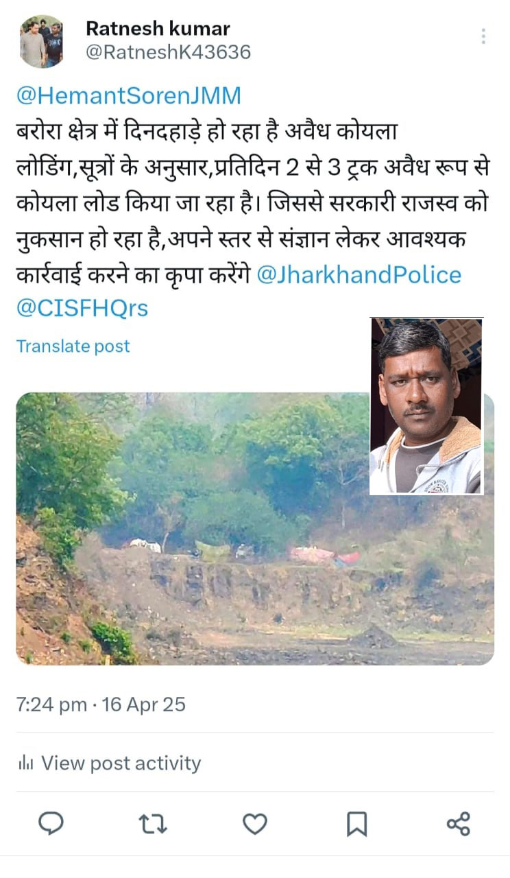हैरानी की बात यह है कि यह सब दिनदहाड़े हो रहा है, जिसको लेकर अखिल भारतीय पिछड़ा वर्ग संघ के जिलाध्यक्ष सह रत्नेश कुमार ने मुख्यमंत्री झारखंड पुलिस और सीआईएफ को ट्वीट कर कार्रवाई की मांग की है।