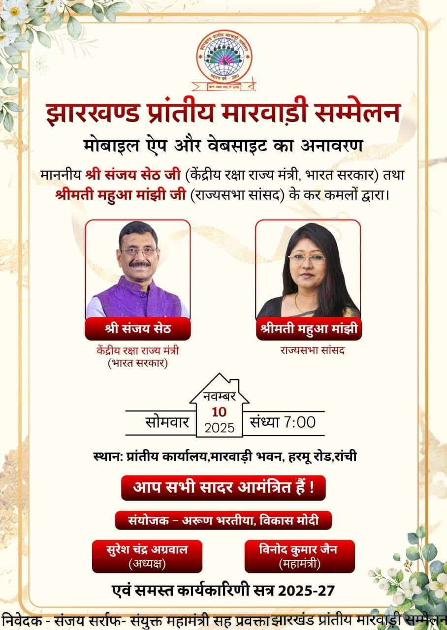 टीम एबीएन, रांची। नगर की 112 वर्ष पुरानी संस्था मारवाड़ी सहायक समिति के द्वारा संचालित मारवाड़ी भवन परिसर हरमू रोड में पूर्ण वातानुकूलित बहुउद्देशीय सभागार का शुभ उद्घाटन 10 नवंबर 2025 दिन सोमवार को सांय 5:30 एवं सांय 7:00 बजे से भजन- संध्या कार्यक्रम का आयोजन किया गया है।