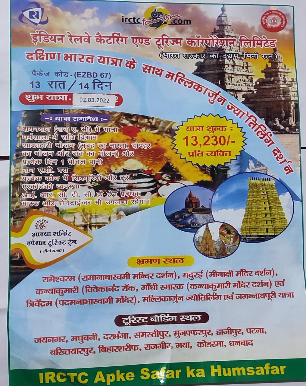 टीम एबीएन, हजारीबाग। आस्था सर्किट स्पेशल पर्यटन ट्रेन का परिचालन दक्षिण भारत यात्रा के साथ मल्लिकार्जुन ज्योतिर्लिंग दर्शन इंडियन रेलवे कैटरिंग टूरिज्म कारपोरेशन लिमिटेड (IRCTC ), भारत सरकार के द्वारा की जा रही है।जो दिनांक 02 मार्च को रवाना होकर पुनः 15 मार्च को वापस आएगी। यह ट्रेन दिनांक 02 मार्च को जयनगर से खुलकर और मधुबनी, दरभंगा, समस्तीपुर, मुजाफरपुर, हाजीपुर, पटना, बख्तियारपुर, बिहारशरीफ, राजगीर, गया, कोडरमा, बोकारो हटिया राउरकेला और झारसुगड़ा होते रामनाथ स्वामी मंदिर मदुरई (मीनाक्षी मंदिर) कन्या कुमारी (कन्याकुमारी टेम्पल और विवेकानंद रॉक) और त्रिवेंद्रम (पदमाननस्वामी टेंपल) मल्लिकार्जुन ज्योतिर्लिंग एवं जगन्नाथ पुरी के तीर्थ स्थल का दर्शन कराते हुए दिनांक 15 मार्च को लौट कर वापस आएगी। इसका कुल किराया प्रति व्यक्ति 13,230 रुपये है। यात्रा समावेश इस यात्रा में पर्यटकों के लिए स्लीपर क्लास से यात्रा शाकाहारी भोजन, घूमने के लिए बस, रहने के लिए धर्मशाला की व्यवस्था तथा प्रत्येक कोच में सिक्यूरिटी गार्ड, मास्क और सेनेटाइजर की उपलब्धता एवं टूर एस्कॉर्ट की व्यवस्था की गयी है। बुकिंग इन पर्यटक यात्रा सम्बन्धी विस्तृत जानकारी एवं बुकिंग के लिए IRCTC, बिस्कोमान टावर (चौथा तल्ला, पश्चिमी गांधी मैदान, पटना -1 या दूरभाष संख्या 9771440056/52/13 से प्राप्त कर सकते हैं या IRCTC के वेबसाइट www.irctctourism.com पर जाकर बुलिंग कर सकते है या IRCTC के अधिकृत एजेंट से भी बुकिंग करा सकते हैं। विस्तृत यात्रा विवरणिका कार्यालय से प्राप्त कर सकते हैं। इस पर्यटन ट्रेन का पैकेज कोड- EZBD67 है।