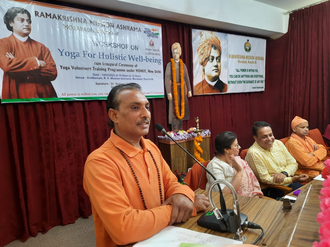 टीम एबीएन, रांची। रामकृष्ण मिशन आश्रम रांची में स्वामी भवेशानंद महाराज के सान्निध्य में आयोजित योगा फ़ॉर हॉलिस्टिक वेल-बिइंग कार्यक्रम में आश्रम के अंतेवासी, साधक और मुख्य रूप से रांची यूनिवर्सिटी तथा श्यामाप्रसाद मुखर्जी यूनिवर्सिटी के योग डिपार्टमेंट के छात्र-छात्राओं को सम्बोधित करते हुए मुक्तरथ जी ने बताया कि योग को सरलता से आप न लें। यह न तो शारीरिक व्यायाम है और न ही ध्यान में चुपचाप बैठ जाने की क्रिया है। योग को अपने जीवन में बहुत अच्छे से उतारें और उसका अनुभव करें। एक-एक आसन और प्राणायाम को धैर्यपूर्वक, मन और भावनाओं से युक्त होकर लम्बे समय तक करें तब तभी योग के मर्म को आप समझ सकते हैं। स्वामी विवेकानंद के कर्मयोग, ज्ञानयोग, राजयोग और भक्तियोग के अभ्यासों द्वारा आप अपने चित्त को शांत कर जीवन के मर्म को समझना बहुत जरूरी है। हां, यह भी सत्य है कि योग आपके अनेकों व्याधियों को नष्ट कर सकता है पर यदि आपके जीवन पद्धति में योग नहीं उतर पाया तो तो आप बार-बार कभी शारीरिक रोग से, कभी मानसिक रोग से, कभी व्यावहारिक रोग से, तो कभी सामाजिक रोग से परेशान होते ही रहेंगे। रामकृष्ण मिशन आश्रम प्रदेश में योगयुक्त-रोगमुक्त झारखण्ड की परिकल्पना को लेकर आज से अपना अभियान शुरू कर दिया है, जिसमें पूरे प्रदेश में एक लाख योग वॉलेंटियर तैयार करने का लक्ष्य रखा है और इस कार्यक्रम के सहयोगी हैं। स्वामी मुक्तरथ तथा इनका सत्यानन्द योग मिशन। आरके मिशन के कर्मठ योग साधक प्रीतम बनिक कार्यक्रम को गांव-गांव तक फैलाने का कार्य कर रहे हैं। आज के कार्यक्रम के प्रमुख वक्ता डॉ निशान्त वैभव योग और स्ट्रेस पर अपना व्यख्यान दिये तथा परिणीता सिंह अपने विचार रखे।