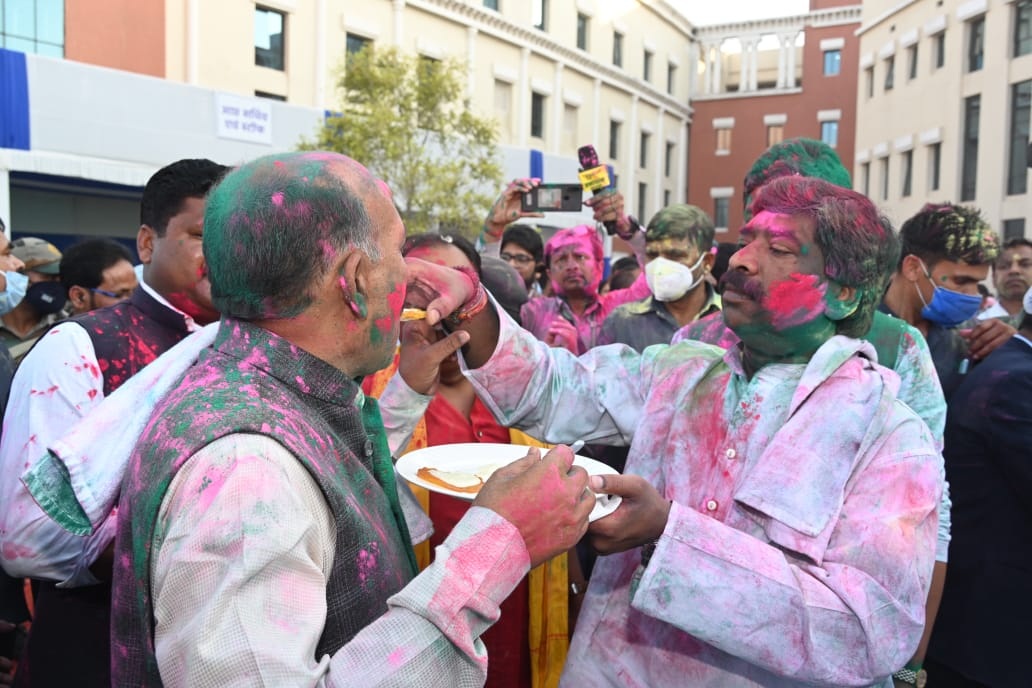 टीम एबीएन, रांची। झारखंड विधानसभा में होली के रं ग और गुलाल दिखे। विधानसभा परिसर में सभी माननीय होलियाना मूड में दिखे। मौका था होली मिलन समारोह का, जिसमें मुख्यमंत्री हेमंत सोरेन न केवल होली के गीत पर झूमे। बल्कि विपक्षी दल भाजपा के सदस्यों से गला मिलकर होली की शुभकामनाएं दी। झारखंड विधानसभा में होली जमकर खेली गई। यहां सत्ता पक्ष से लेकर विपक्ष सभी एक ही रंग में रंगे नजर आए। मुख्यमंत्री हेमंत सोरेन ने विपक्षी दल के विधायकों को गले मिलकर होली की शुभकामनाएं दी, तो वहीं स्पीकर रबीन्द्रनाथ महतो ने मुख्यमंत्री को जलेबी खिलाकर होली की मिठास जीवन में बनी रहे इसकी कामना की। सदन की कार्यवाही खत्म होने के बाद विधानसभा परिसर में आयोजित होली मिलन समारोह के दौरान होली की उमंग में डूबे विधायक, मंत्री के साथ मुख्यमंत्री हेमंत सोरेन ने फगुआ का पारंपरिक गीत गाकर राज्यवासियों को होली की शुभकामनाएं दी। मौके पर स्पीकर रबीन्द्र नाथ महतो ने राज्यवासियों को होली की शुभकामनाएं देते हुए कहा कि होली की तरह सालों भर लोगों के परिवार में खुशियां बनी रहे। वहीं, मुख्यमंत्री ने कहा कि होली आपसी भाईचारा और उमंग का पर्व है जिसे हम सभी मिलकर मनाएं। उन्होंने राज्यवासियों को होली की शुभकामनाएं देते हुए शांतिपूर्ण और भाईचारगी के साथ होली मनाने की अपील की। इस अवसर पर विधायक शिवपूजन मेहता और अंबा प्रसाद ने भी जमकर होली खेली और एक दूसरे को अबीर गुलाल लगाकर होली की बधाई देते हुए नजर आए। अपने पुराने घर भाजपा से राजद में शामिल होकर मंत्री तक की कुर्सी पाने में सफल रहे श्रम मंत्री सत्यानंद भोक्ता सबसे पहले होली मिलन कार्यक्रम में भाजपा विधायकों के साथ पहुंचे। भाजपा विधायक राज सिन्हा, अनंत ओझा, बिरंची नारायण ने होली के गीत गाकर खूब रंग जमाया। इस दौरान मंत्री झूमने लगे और झाल बजाकर विपक्ष के साथ होली मनाई।