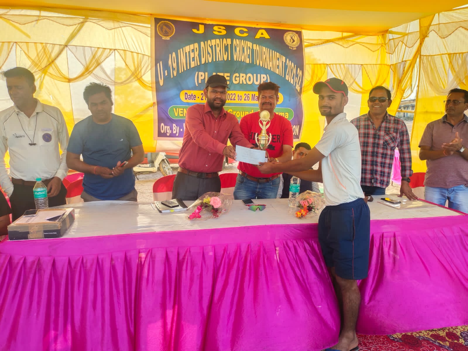 टीम एबीएन, कोडरमा। झारखंड स्टेट क्रिकेट एसोसिएशन के तत्वावधान में खेले जाने वाले इंटर डिस्ट्रिक्ट अंडर-19 क्रिकेट टूर्नामेंट में आज कोडरमा में कोडरमा और खूंटी के बीच मैच हुआ। टॉस जीतकर पहले बल्लेबाजी करते हुए कोडरमा ने निर्धारित 50 ओवर में 5 विकेट के नुकसान पर 277 रन बनाया। जिसमें रोहित भारती ने 102 रन नीरज यादव ने 74 रन और कुमार हेमंत ने 28 रन का योगदान दिया गेंदबाजी करते हुए खूंटी की ओर से मित जैन दिव्यांशु सिंह सत्यम सिंह ने एक-एक विकेट चटकाए। बाद में बल्लेबाजी करने उतरी खूंटी की टीम 36.4 ओवर में 177 रन पर ऑल आउट हो गई। खूंटी की ओर से रामशीष ने 38 रन मोहम्मद आकिब ने 32 रन का योगदान दिया। गेंदबाजी करते हुए कोडरमा की ओर से कुमार हेमंत ने 5 विकेट और शुभम सिन्हा ने तीन विकेट चटकाए। कोडरमा के रोहित भारती को झुमरीतिलैया के नगर प्रशासक विनीत कुमार ने मैन ऑफ द मैच का पुरस्कार दिया। साथ ही उन्होंने अपने स्तर से एक बल्ला भी देने की घोषणा की। मैच आब्जर्वर शशि भूषण चौबे मनोरंजन कांजीलाल और हेमंत ठाकुर थे। वहीं स्कोरर दीपक कुमार थे। मौके पर अमरजीत सिंह छाबड़ा, दिनेश सिंह, आलोक पांडे, मनोज सहाय पिंकू, धीरज पांडे, सोनू खान, धर्मेंद्र कौशिक, ओम प्रकाश, विशाल सूद, उज्जवल पांडे, सुरेंद्र प्रसाद, बिट्टू पांडे, विवेक पांडे, प्रेम पांडे, सुमन कुमार, अमित जयसवाल आदि सैकड़ों खेल प्रेमी मौजूद थे।