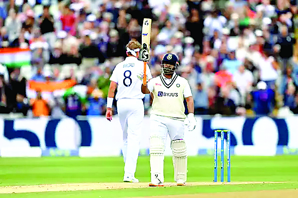 एबीएन स्पोर्ट्स डेस्क। इंग्लैंड और भारत के बीच पांचवा (फिर से निर्धारित) टेस्ट मैच एजबेस्टन में खेला जाएगा। इंग्लैंड ने टॉस जीतकर पहले गेंदबाजी का फैसला लिया है। टीम इंडिया ने पहली पारी में रिषभ पंत के 146 रन और रविंद्र जडेजा के शतक की बदौलत 416 रन बनाए और इंग्लैंड को पहली पारी में 284 रन पर ढेर कर दिया। भारत ने 132 रन की लीड के साथ दूसरी पारी में पुजारा (66) और पंत (57) की अर्धशतकीय पारियों की बदौलत 245 रन बनाते हुए इंग्लैंड को 378 रन का लक्ष्य दिया है। बता दें कि यह मैच पिछले साल की पांच मैचों की टेस्ट सीरीज का हिस्सा होगा जिसमें भारत 2-1 से आगे हैं। पांचवें टेस्ट को पिछले साल कोविड-19 के कारण स्थगित कर दिया गया था। यह मैच वर्ल्ड टेस्ट चैम्पियनशिप का हिस्सा है। पहला दिन : शुभमन गिल 24 गेदों पर चार चौकों की मदद से 17 रन बनाकर जेम्स एंडरसन की गेंद पर जैक क्रॉली के हाथों कैच आउट हुए। एंडरसन की गेंद पर पुजारा ने क्रॉली को कैच थमा दिया और वह सस्ते में पवेलियन लौट गए। पुजारा 46 गेंदों पर 2 चौकों की मदद से 13 रन बनाकर आउट हुए। लंच के बाद जब मैच दोबारा शुरू हुआ तो टीम इंडिया ने हनुमा विहारी का भी विकेट गंवा लिया। ऐसा लगा कि पंत के साथ मिलकर अच्छे टच में नजर आ रहे कोहली अच्छी पारी खेलेंगे लेकिन इंगलैंड के तेज गेंदबाज मैटी पॉट्स ने उन्हें 11 रन पर बोल्ड कर दिया। श्रेयस अय्यर को जेम्स एंडरसन ने बाऊंसर फेंककर खूब परेशान किया। उन्होंने आखिरकार श्रेयस को पवेलियन का रास्ता दिखाया। पंत ने जडेजा के साथ साझेदारी निभाते हुए अपना अर्धशतक पूरा किया। टी ब्रेक तक भारत ने पांच विकेट खोकर 174 रन बना लिए थे। टी ब्रेक के बाद भी पंत ने अपना स्वाभाविक खेल जारी रखा और 100+ की स्ट्राइक रेट से रन बनाए। उन्होंने 89 गेंदों पर अपना अर्धशतक पूरा किया। साथ ही रविंद्र जडेजा अपना अर्धशतक बनाने में सफल रहे। शतक के बाद पंत ने तेजी से रन बनाए लेकिन इंगलैंड के स्पिनर जो रूट उनकी विकेट लेने में सफल रहे। पंत ने 111 गेंदों में 20 चौके और चार छक्कों की मदद से 146 रन बनाए। पंत का विकेट गिरते ही शार्दुल ठाकुर मैदान पर आए लेकिन वह एक ही रन बनाकर आऊट हो गए। दूसरा दिन : मोहम्मद शमी ने भी आते ही हाथ दिखाए और स्टोक्स की गेंदों पर शानदार शॉट लगाए। शमी को स्टुअर्ट ब्रॉड ने 16 रन के स्कोर पर जैक लीच के हाथों आऊट कराया। रविंद्र जडेजा ने इस दौरान अपना शतक पूरा किया। उन्हें 104 रन के स्कोर पर एंडरसन ने पवेलियन की राह दिखाई। भारत की आखिरी विकेट 416 रन पर गिरी जब एंडरसन ने अपनी गेंद पर सिराज (2) का विकेट निकाला। बुमराह 31 रन बनाकर नाबाद रहे। इंगलैंड की शुरुआत खराब रही। भारतीय गेंदबाज बुमराह ने अपने दूसरे ही ओवर में एलेक्स लीस को 6 रन पर बोल्ड कर दिया। बारिश के कारण मैच प्रभावित रहा। जब दोबारा शुरू हुआ 