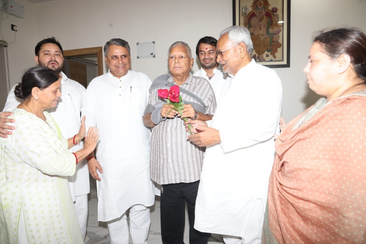 टीम एबीएन, पटना/रांची। बिहार में राजद के साथ हाथ मिलाकर सत्ता बनाने के बाद आज बिहार के मुख्यमंत्री नीतीश कुमार ने राष्ट्रीय जनता दल (राजद) के सुप्रीमो लालू प्रसाद यादव से पहली बार मुलाकात की। नीतीश कुमार की पार्टी ने बिहार राज्य में आरजेडी के साथ नई सरकार बनाने के लिए बाद के साथ बिहार के पूर्व सीएम लालू प्रसाद यादव और उनके परिवार के साथ नया संबंध फिर स्थापित किया है। इसी के तहत सीएम नीतीश कुमार ने लालू यादव से मुलाकात की। लालू प्रसाद यादव के बेटे और बिहार के उपमुख्यमंत्री तेजस्वी यादव ने ट्विटर पर लालू यादव और नीतीश कुमार के बीच हुईं मीटिंग की तस्वीरें शेयर की। इन फोटोज में बिहार के दो दिग्गज नेता लालू और नीतीश एक दूसरे को लाल गुलाब देते हुए नजर आ रहे हैं। इन फोटोज में तेजस्वी यादव के अलावा उनके भाई, तेज प्रताप, राजद प्रमुख की पत्नी राबड़ी देवी के अलावा बैठक में मौजूद नजर आ रहे हैं।