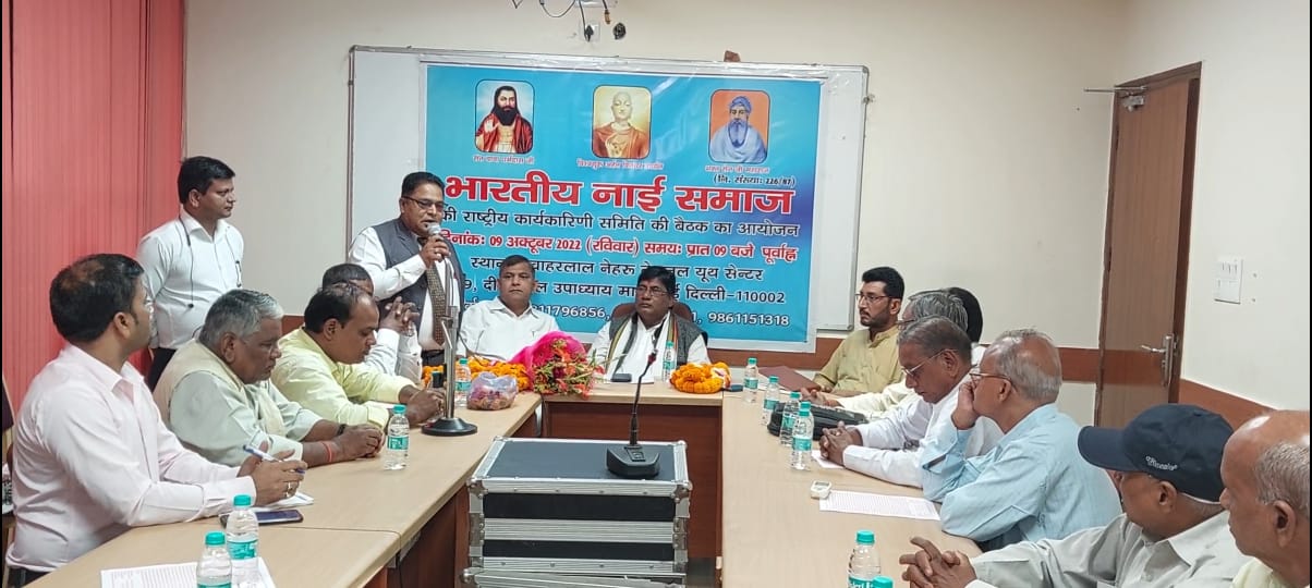 टीम एबीएन, हजारीबाग। भारतीय नाई समाज भारत का राष्ट्रीय कार्यसमिति का बैठक जवाहर नेहरू यूथ सेंटर, दिल्ली में आठ और नौ अक्टूबर को हुआ। इस बैठक में पूरे भारत से समाज के पदाधिकारी, सक्रिय सदस्य भाग लिया। बैठक की अध्यक्षता राष्ट्रीय अध्यक्ष माननीय अमरेश ठाकुर ने किया। संचालन राष्ट्रीय सचिव संजय ठाकुर ने किया। सुरेश ठाकुर प्रदेश अध्यक्ष झारखंड ने इस बैठक में भाग लिए और अपनी संबोधन में कहा कि जननायक कर्पूरी ठाकुर को भारत रत्न देने की मांग केंद्र सरकार से किया जाय। समाज के सभी तपके के लोगो का उत्थान करने पर विचार विमर्श किया गया। साथ ही साथ समाज को दहेज मुक्त करने पर रणनीति बनाई गई। साथ ही समाज में मृत्यु भोज जैसी कुरीतियों को बंद करने निर्णय लिया गया और इसके साथ पूरे भारत में बिखरे समाज को एक मंच पर लाने पर रणनीति बनाई गई।भारतीय नाई समाज का नीति और सिद्धांत को समाज के जन जन तक पहुंचे पर दिशा निर्देश जारी किया गया। सारे पहलू पर गहन विचार विमर्श कर समाज को एक नई दिशा दी गयी। बैठक में अर्जुन शर्मा पूर्व सचिव, राजू ठाकुर कोषाध्यक्ष, राज ठाकुर प्रदेश उपाध्यक्ष, बैद्यनाथ ठाकुर, कार्यकारी अध्यक्ष बिहार, संजय ठाकुर, सुरेंद्र शर्मा, सुरेश कुमार, रामपुकर ठाकुर, शिवनाथ शर्मा, बृजभूषण ठाकुर, अयोध्या ठाकुर टेंट, श्यामलाल सेन, सुंदर सेन, आर सीशर्मा, कृष्ण ठाकुर, राजेंद्र ठाकुर, अजय भूषण प्रदेश अध्यक्ष बिहार सहित अन्य कई गणमान्य मौजूद रहे। धन्यवाद ज्ञापन राष्ट्रीय कार्यकारी अध्यक्ष माननीय गजेंद्र सिंह ठाकुर ने किया।