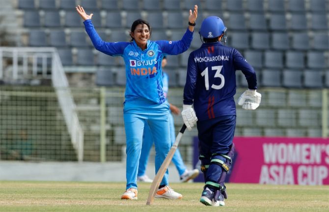 एबीएन स्पोर्ट्स डेस्क। महिला एशिया कप 2022 जीतने की प्रबल दावेदार भारतीय टीम ने स्नेह राणा (9/3) की अगुवाई में गेंदबाजों के शानदार प्रदर्शन की बदौलत थाईलैंड को एकतरफा मुकाबले में सोमवार को नौ विकेट से मात दी। थाईलैंड ने पहले बल्लेबाजी करते हुए 15.1 ओवर में आॅलआउट होने से पहले केवल 37 रन बनाये। इस छोटे लक्ष्य को भारत ने छह ओवर में ही हासिल कर लिया।