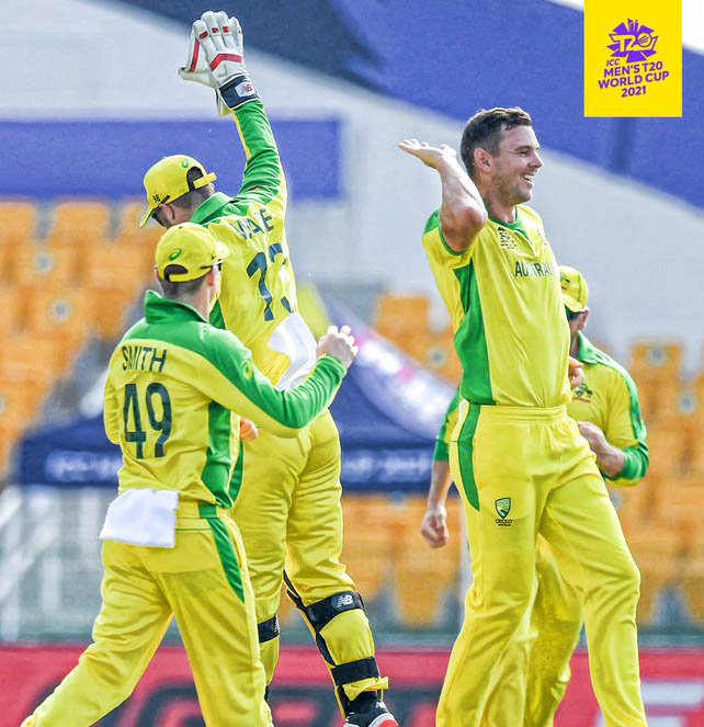एबीएन स्पोर्ट्स डेस्क। आस्ट्रेलिया ने अपने गेंदबाजों के शानदार प्रदर्शन की बदौलत दक्षिण अफ्रीका को यहां शनिवार को टी-20 विश्व कप 2021 के पहले मुकाबले में पांच विकेट से हराकर पूरे अंक हासिल किये। आॅस्ट्रेलिया ने दक्षिण अफ्रीका को ग्रुप एक के इस मुकाबले में नौ विकेट पर 118 रन के मामूली स्कोर पर रोकने के बाद 19.4 ओवर में पांच विकेट पर 121 रन बनाकर टूनार्मेंट में विजयी शुरूआत की। लक्ष्य मुश्किल नहीं था और कप्तान आरोन फिंच के शून्य और डेविड वार्नर के 14 रन बनाकर टीम के 20 रन के स्कोर तक पवेलियन लौट जाने के बाद स्टीवन स्मिथ ने 34 गेंदों में तीन चौकों की मदद से 35 रन ,ग्लेन मैक्सवेल ने 21 गेंदों में 18 रन , मार्कस स्टॉयनिस ने 16 गेंदों में तीन चौकों के सहारे नाबाद 24 और विकेटकीपर मैथ्यू वेड ने 10 गेंदों में दो चौकों के सहारे नाबाद 15 बनाकर टीम को जीत दिला दी। मैच में 19 रन पर दो विकेट लेने वाले तेज गेंदबाज जोश हेजलवुड को प्लेयर आॅफ द मैच का पुरस्कार मिला। टॉस हार कर पहले बल्लेबाजी करने उतरी दक्षिण अफ्रीकाई टीम शुरूआत से ही संघर्ष करती दिखी, जिसके चलते वह 20 ओवर में नौ विकेट पर 118 रन ही बना सकी। आॅस्ट्रेलियाई गेंदबाजों, खास कर जोश हेजलवुड, पैट कमिंस और एडम जम्पा ने कसी हुई गेंदबाजी के जरिए तीनों सलामी बल्लेबाजों को बांध कर रखा। परिणामस्वरूप दबाव में आकर उन्होंने अपना विकेट गंवा दिए। क्विंटन डी कॉक के साथ ओपनिंग करने आए कप्तान तेम्बा बावुमा सबसे पहला शिकार बने। पार्ट टाइम गेंदबाज ग्लेन मैक्सवेल ने उन्हें आउट किया। उन्होंने दो शानदार चौकों की मदद से सात गेंदों पर 12 रन बनाए। वहीं डी कॉक एक चौके की मदद से 12 गेंदों पर सात, जबकि आखिरी अभ्यास मैच में पाकिस्तान के खिलाफ विस्फोटक शतक जड़ने वाले रैसी वान डेर डुसेन तीन गेंदों पर दो रन बना कर आउट हुए। शीर्ष क्रम के फ्लॉप रहने के बाद मध्य क्रम के बल्लेबाज एडेन माक्ररम ने पारी को संभाला, जिसमें हेनरिक क्लासेन ने उनका साथ दिया, हालांकि क्लासेन लंबी पारी नहीं खेल पाए और दो चौकों की मदद से 13 गेंदों पर 13 रन बना कर आउट हो गए। इसके बाद अनुभवी बल्लेबाज डेविड मिलर ने माक्ररम के साथ पारी को आगे बढ़ाया। दोनों ने पांचवें विकेट के लिए 34 रन की महत्वपूर्ण साझेदारी की। मिलर हालांकि अपना स्वभाविक खेल नहीं खेल पाए और बगैर कोई बाउंड्री लगाए 18 गेंदों पर 16 रन बना कर अपना विकेट गंवा दिया, लेकिन माक्ररम दूसरे छोर पर टिके रहे और तीन चौकों और एक छक्के की मदद से 36 गेंदों पर 40 रन की अहम पारी खेली। वहीं अंत में तेज गेंदबाज कैगिसो रबादा ने भी एक चौके और एक छक्के के सहारे 23 गेंदों पर 19 रन बनाए। उनके इस योगदान की वजह से टीम 118 के स्कोर तक पहुंच पाई। आॅस्ट्रेलिया की तरफ से जोश हेजलवुड ने चार ओवर में 19, एडम जम्पा ने चार ओवर 