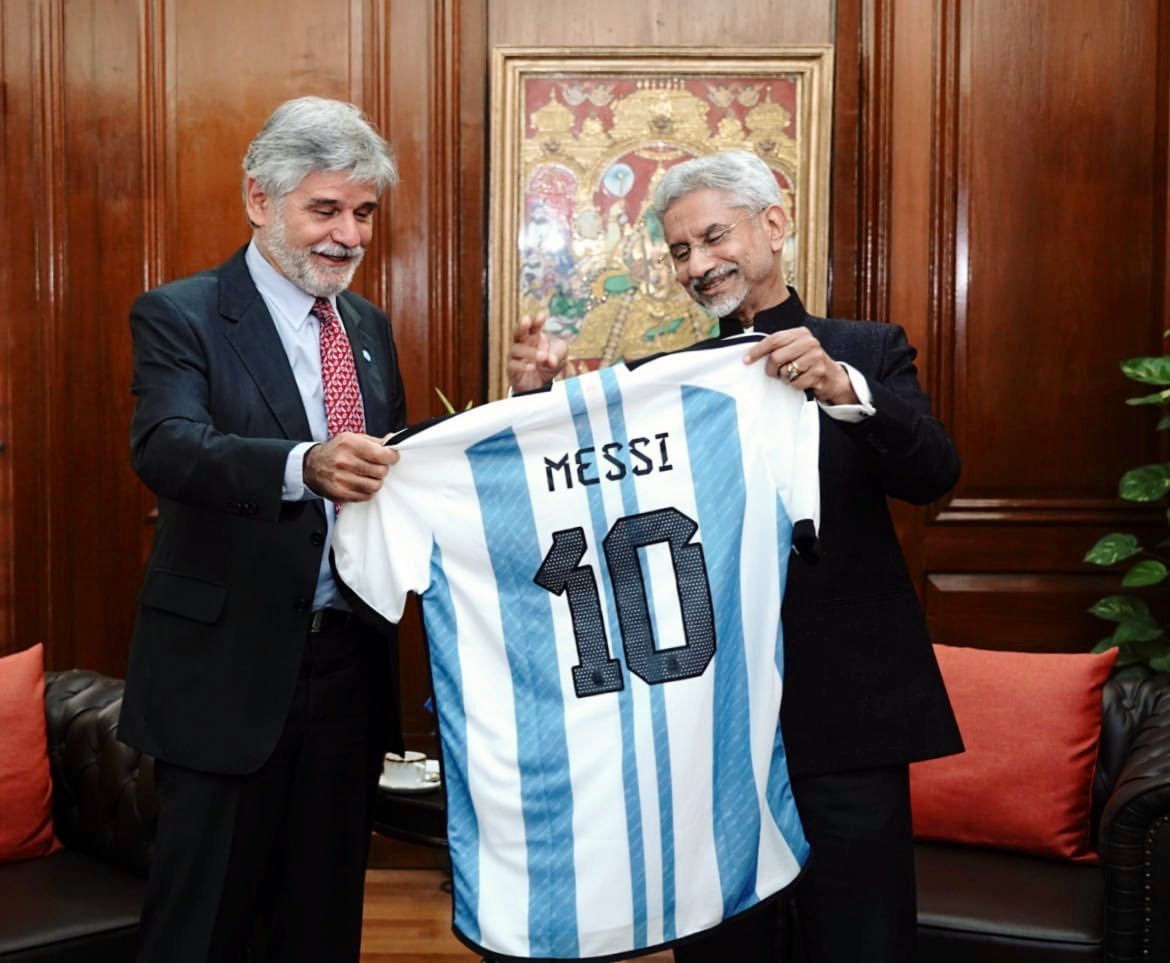एबीएन सेंट्रल डेस्क। भारतीय विदेश मंत्री एस जयशंकर ने अर्जेंटीना के विज्ञान-तकनीक और नवाचार मंत्री डेनियल फिल्म्स के साथ मुलाकात की। इस मुलाकात के बाद अर्जेंटीना के मंत्री ने जयशंकर को फुटबॉल स्टार लियोनल मेसी की जर्सी तोहफे के रूप में दी।