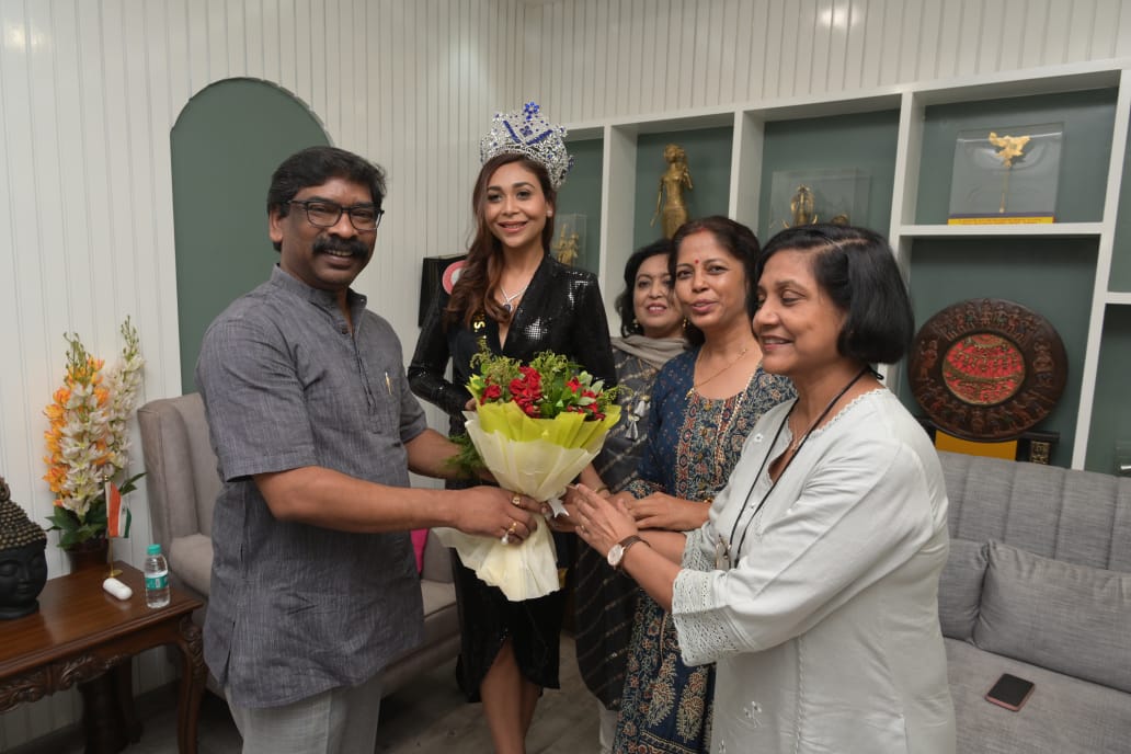 टीम एबीएन, रांची। मुख्यमंत्री हेमन्त सोरेन से आज मिसेज इंडिया वर्ल्ड वाइड की विजेता डॉ अपराजिता सिन्हा ने अपने माता-पिता के संग औपचारिक मुलाकात की। डॉ अपराजिता ने इस प्रतिष्ठित सौंदर्य प्रतियोगिता के अनुभवों को मुख्यमंत्री के साथ साझा किया।